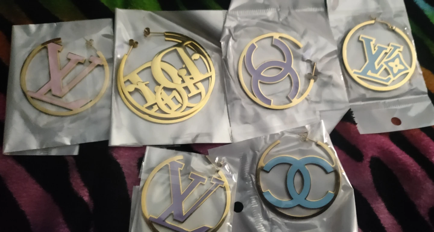 Hoop earrings featuring iconic designer logos. Available in styles inspired by Louis Vuitton, Chanel, and Dior. Stainless steel Metal construction with colored enamel inlay. A stylish accessory for any fashion-forward individual! $35 each