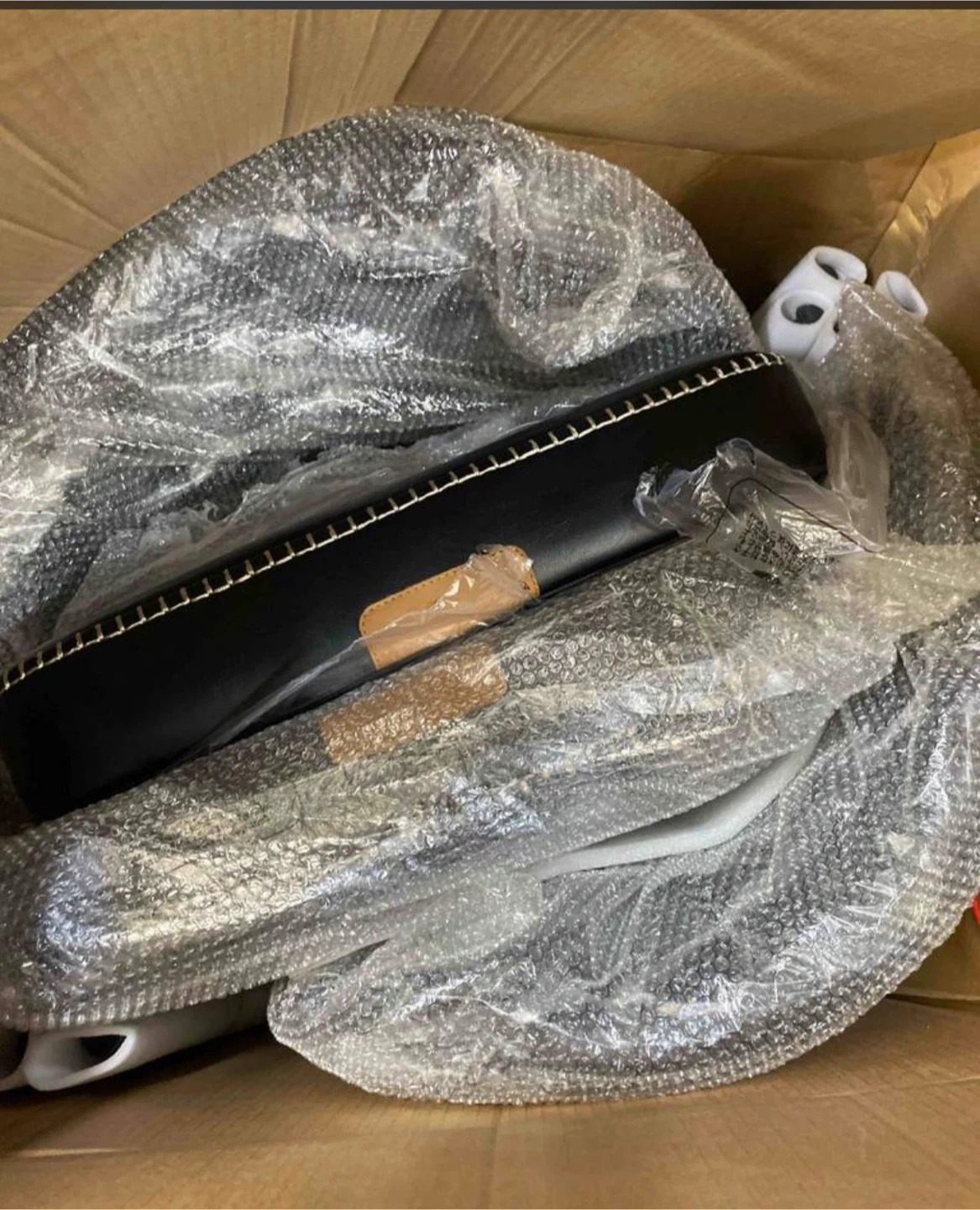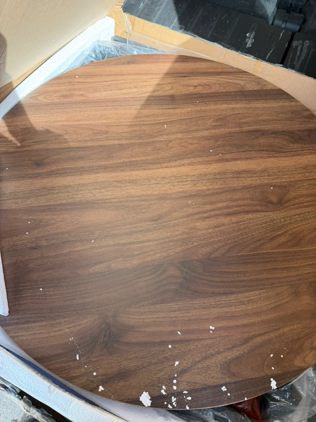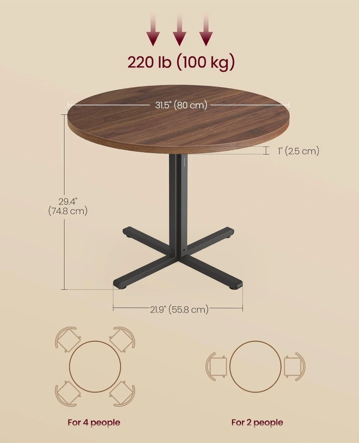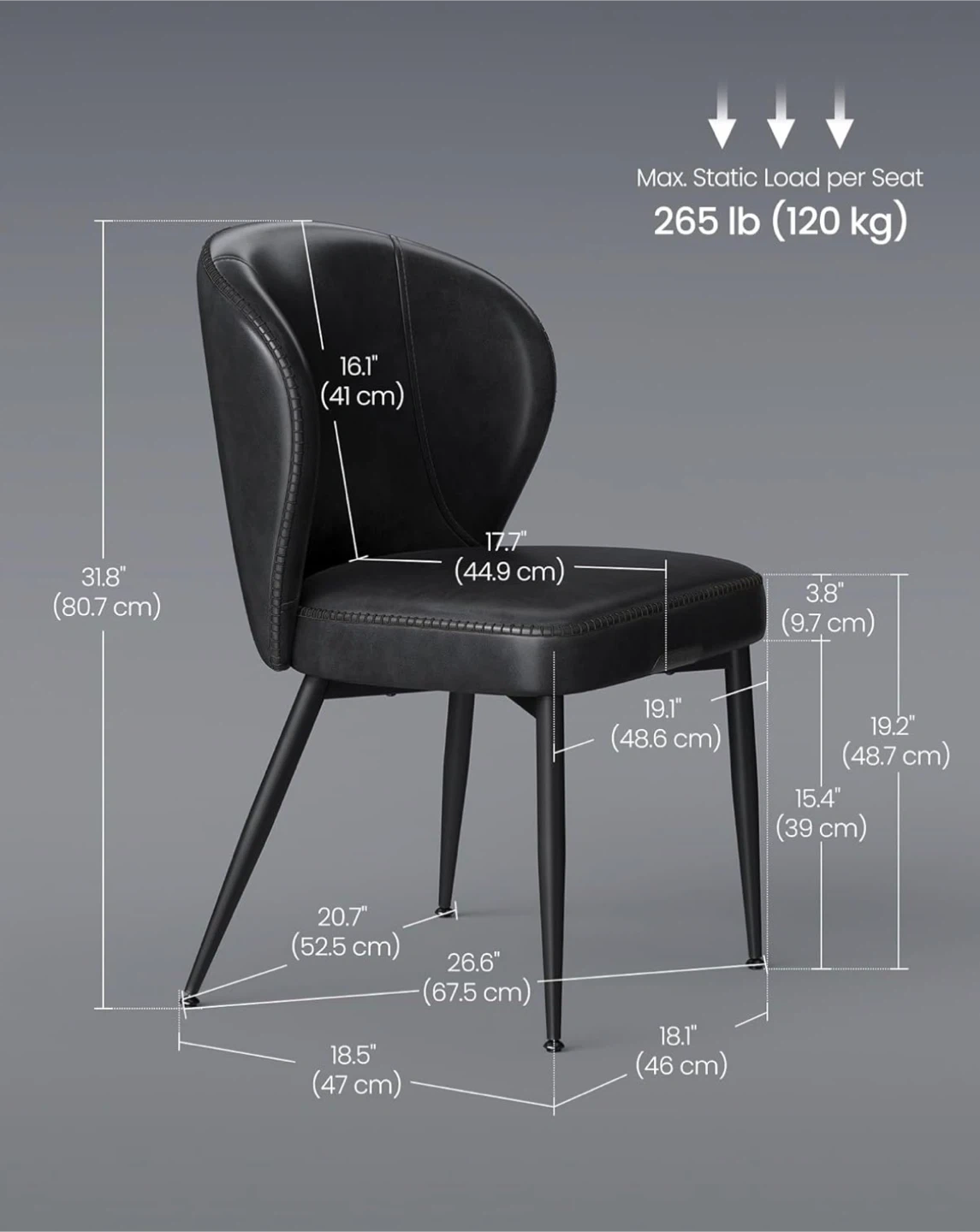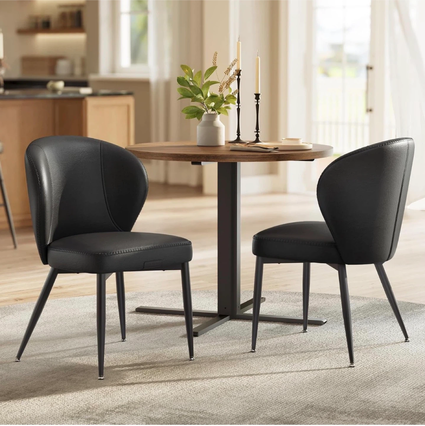 This set includes a round dining table and two black upholstered chairs. The table has a wood-look top and a black metal base. Chairs feature faux leather upholstery and metal legs.