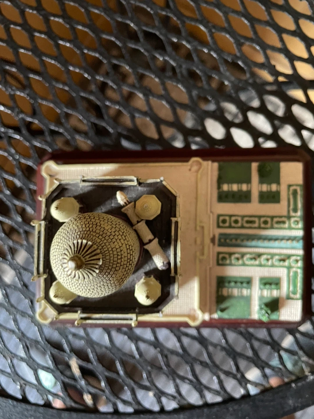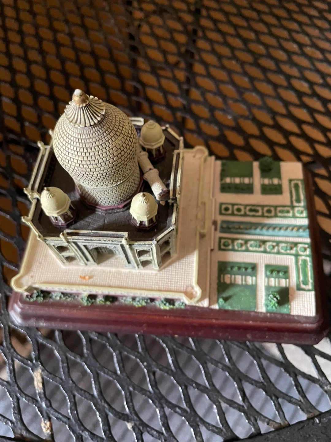 A detailed miniature model of the Taj Mahal from The Legendary Castles Collection. This display piece features intricate architectural details and includes the surrounding garden area. It's made from durable material for long-lasting display.