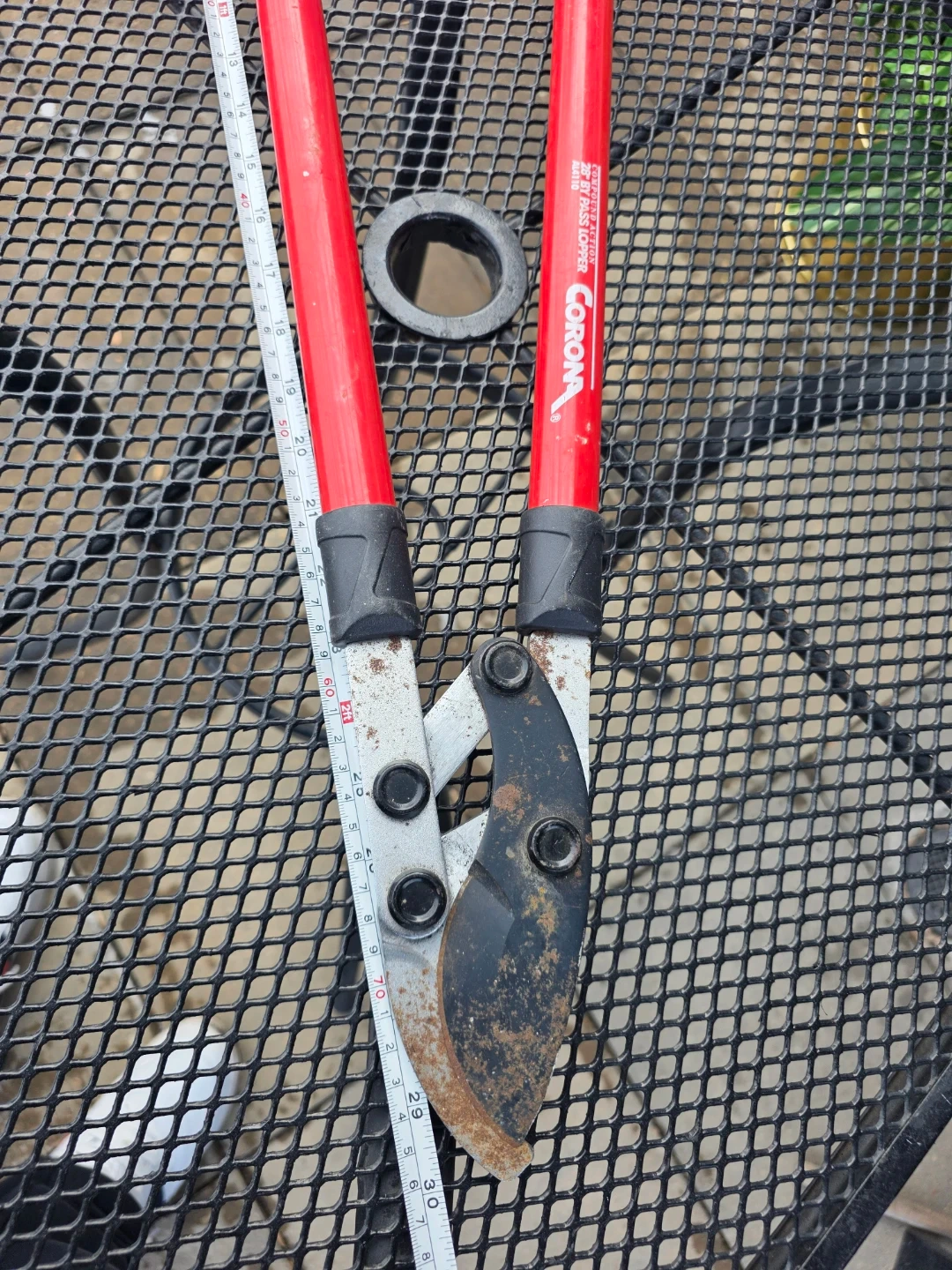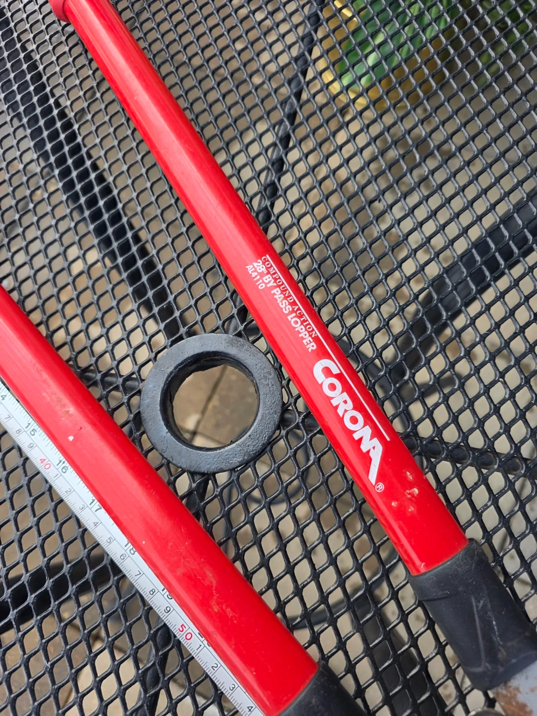 These Corona bypass loppers feature a 2-step cutting action for easy trimming. The handles are red and have black grips. They're great for pruning branches in your yard!