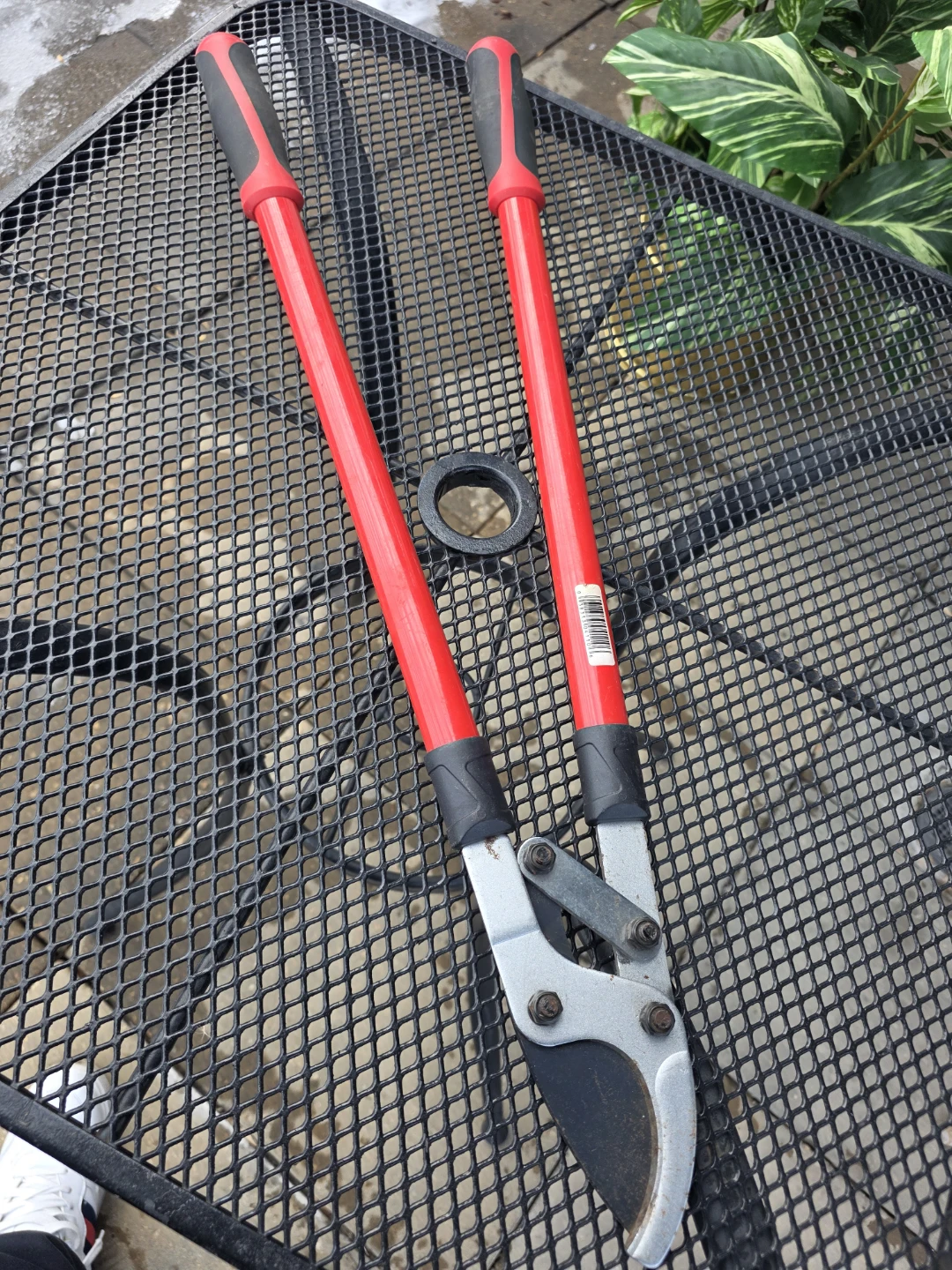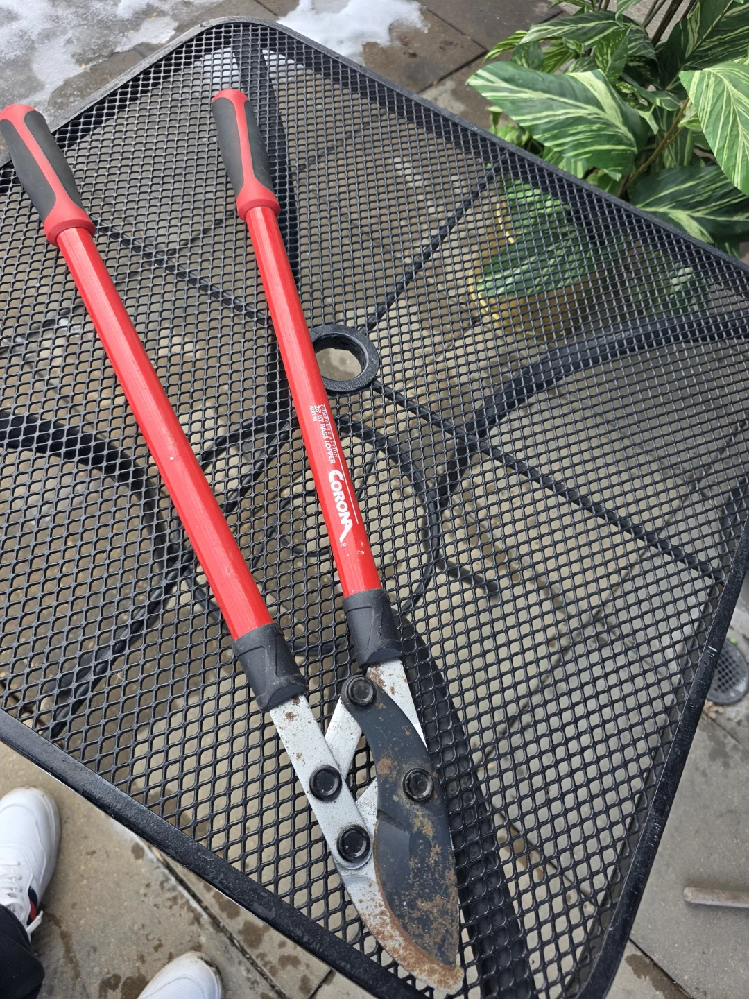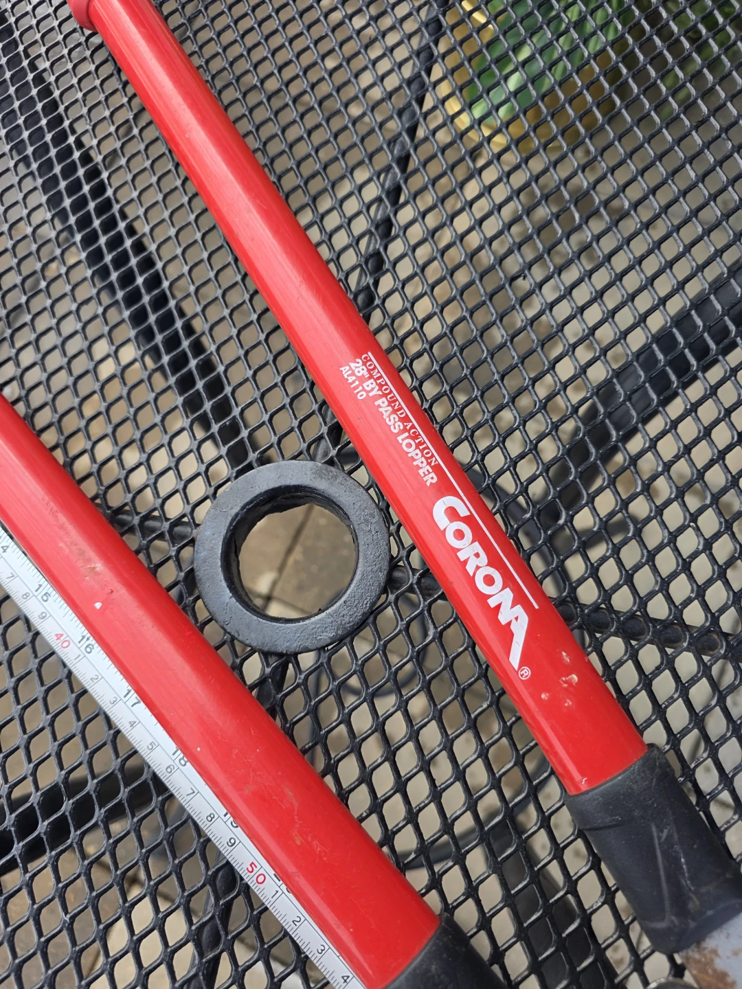 These Corona bypass loppers feature a 2-step cutting action for easy trimming. The handles are red and have black grips. They're great for pruning branches in your yard!