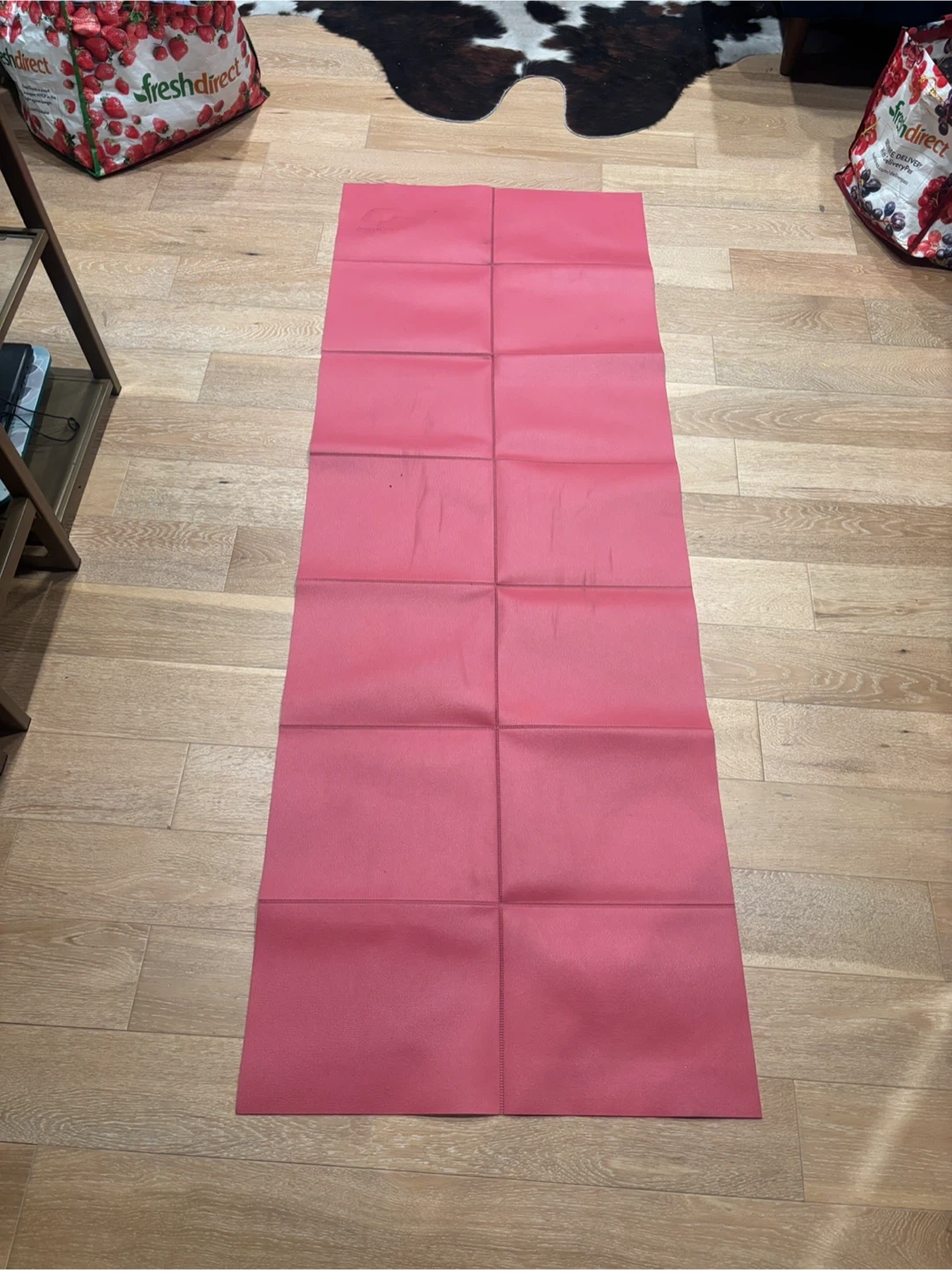 This is a pink yoga mat. It's foldable for easy storage. It's made of durable material and provides a good grip.