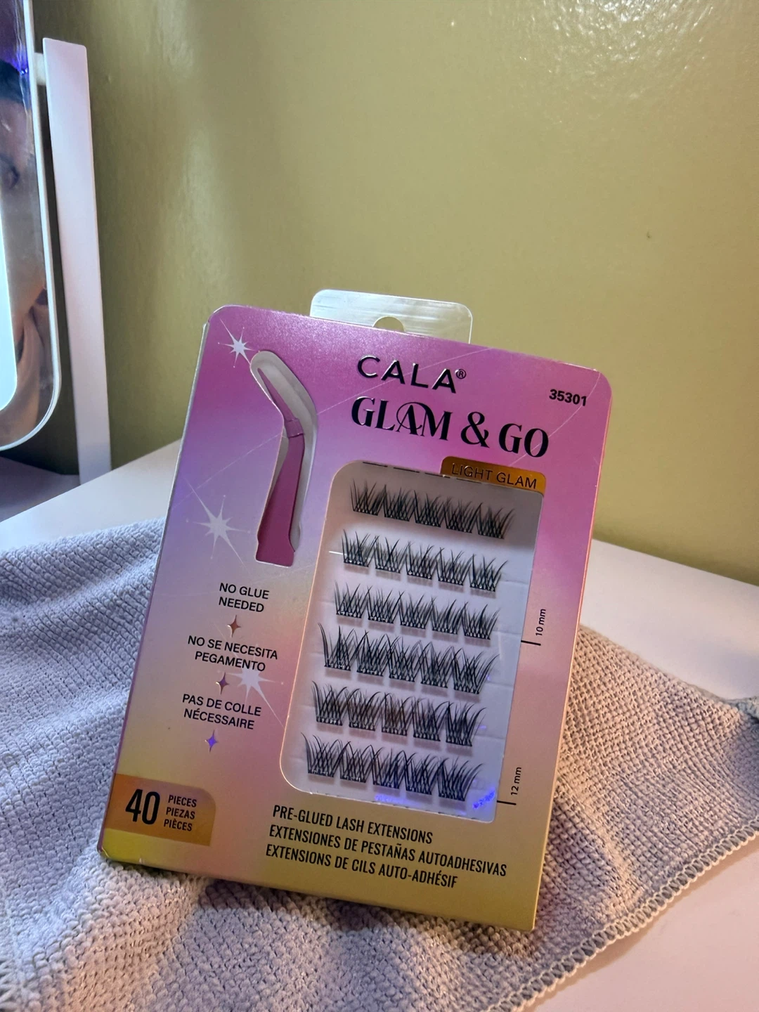 These are CALA Glam & Go pre-glued lash extensions. They require no glue for application and come in 40 pieces. Styles include 10mm and 12mm lengths.