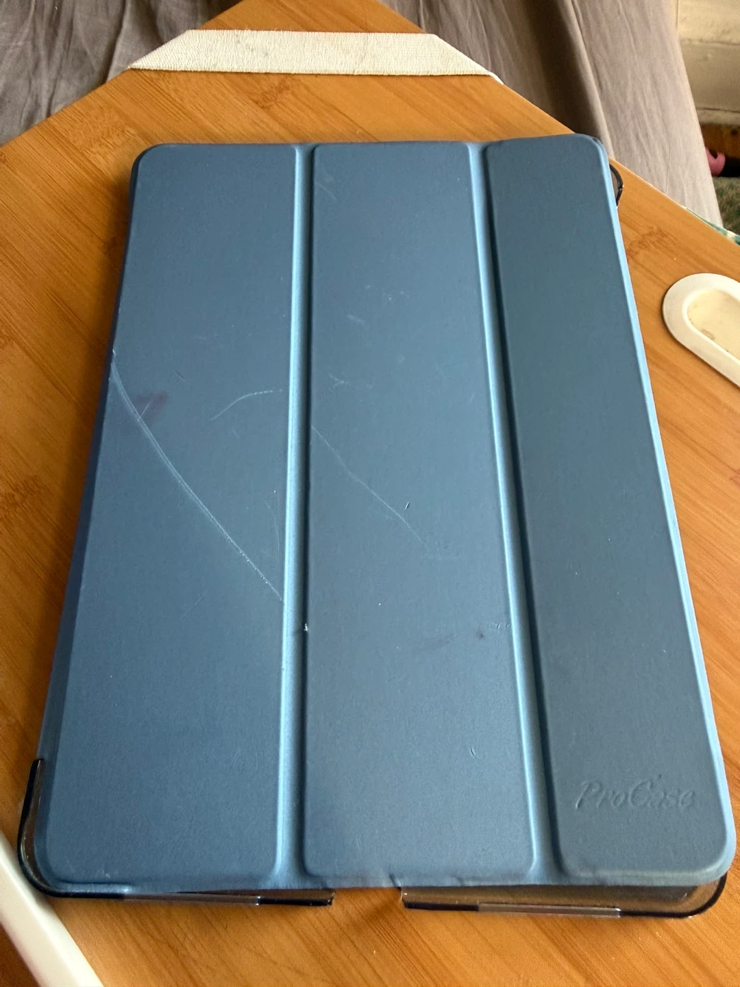 This is a blue ipad tablet case. It's made of a durable material and designed to protect your device. The case features a tri-fold stand for convenient viewing angles.
