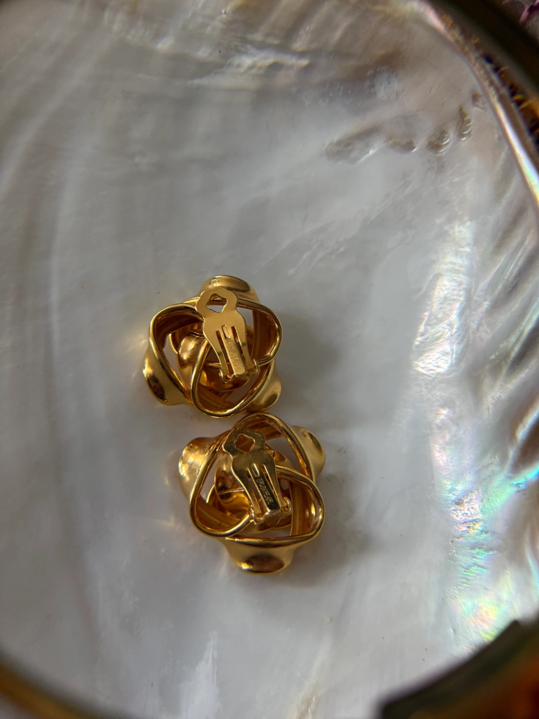 #3 clip on’s, Large Erwin Pearl gold tone earrings. They are signed on the back as shown in the last picture —— $15