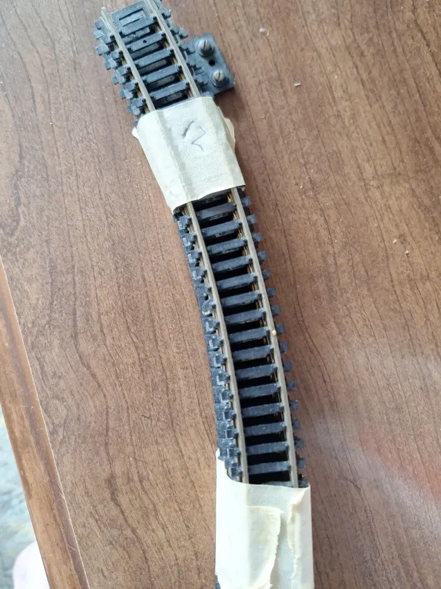 This is a section of model train track. It's made of plastic and metal rails. The track appears to be curved.