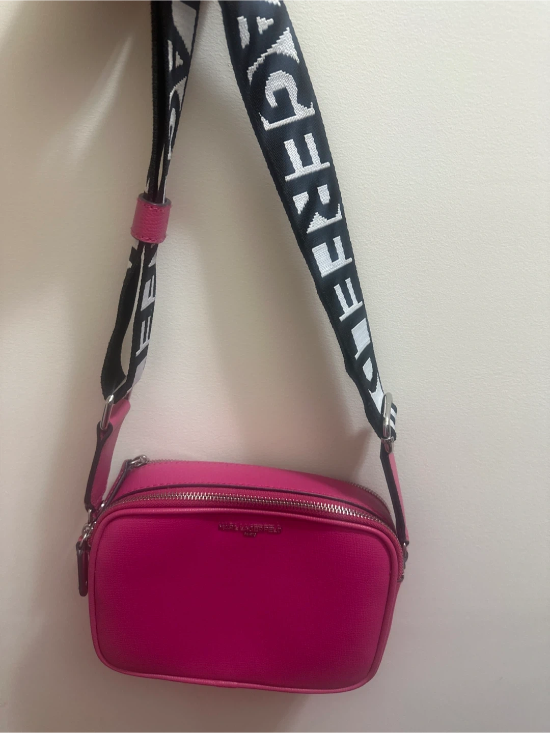Selling a vibrant pink crossbody bag from Karl Lagerfeld Paris! The strap features the brand's name in a bold, contrasting design. It's in great condition and ready for a new owner!