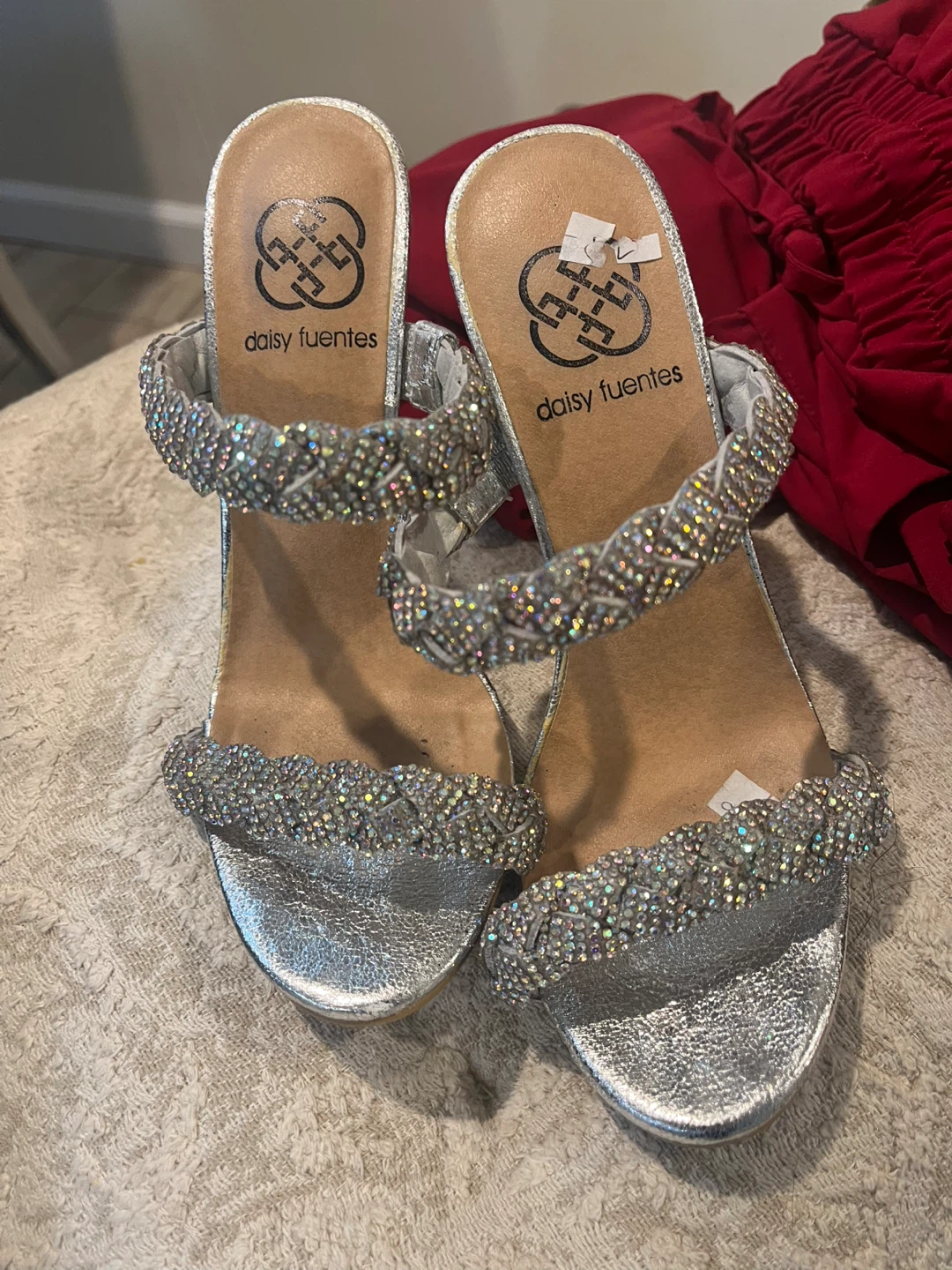 Sparkly silver heeled sandals from Daisy Fuentes. They feature a comfortable ankle strap and are covered in dazzling rhinestones across the straps and toe. These shoes are perfect for adding a touch of glamour to any outfit!