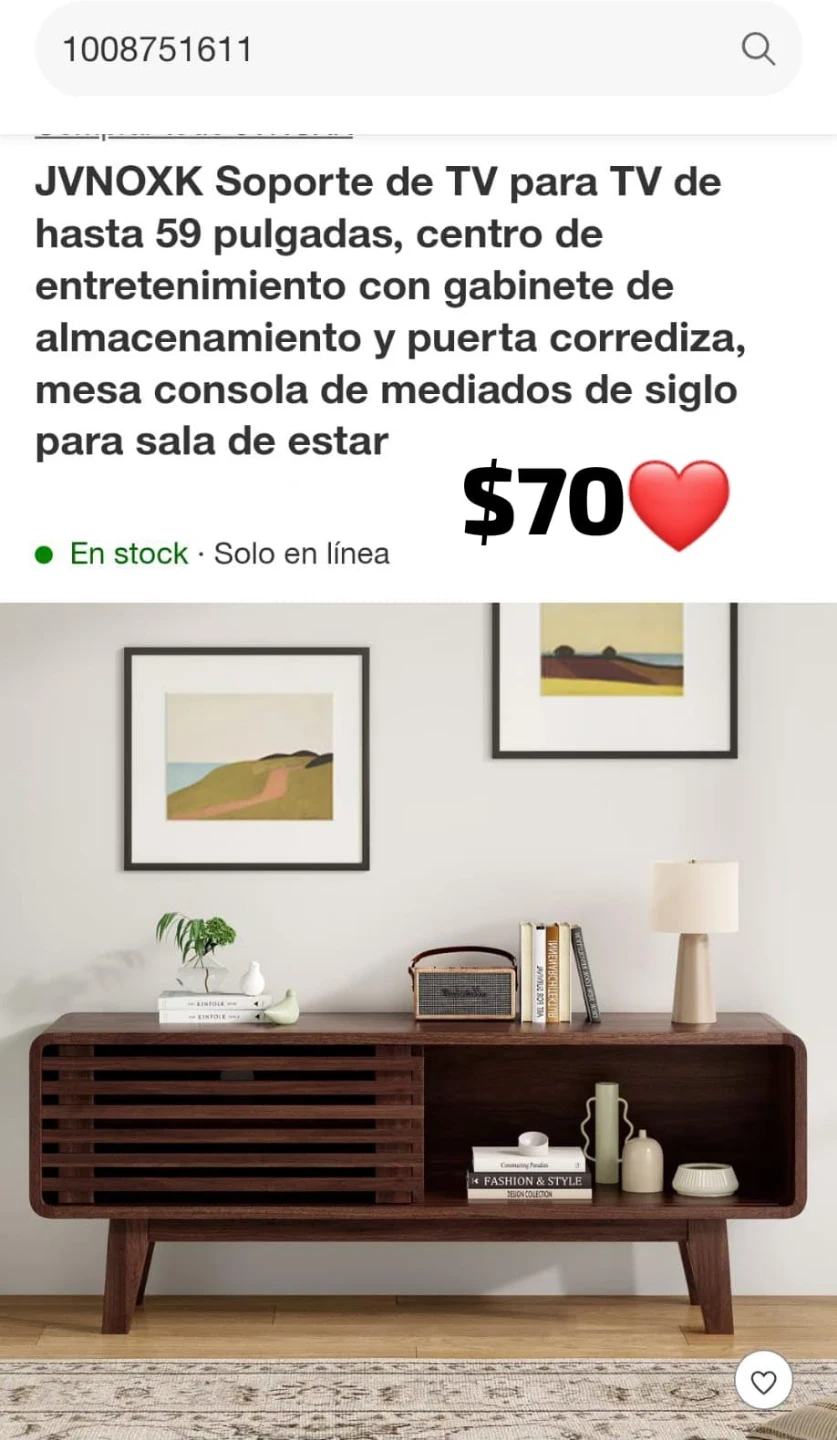JVNOXK entertainment center with storage cabinet and sliding door. Mid-century console table style for living room. Wood material. It has a sliding door and open shelving.