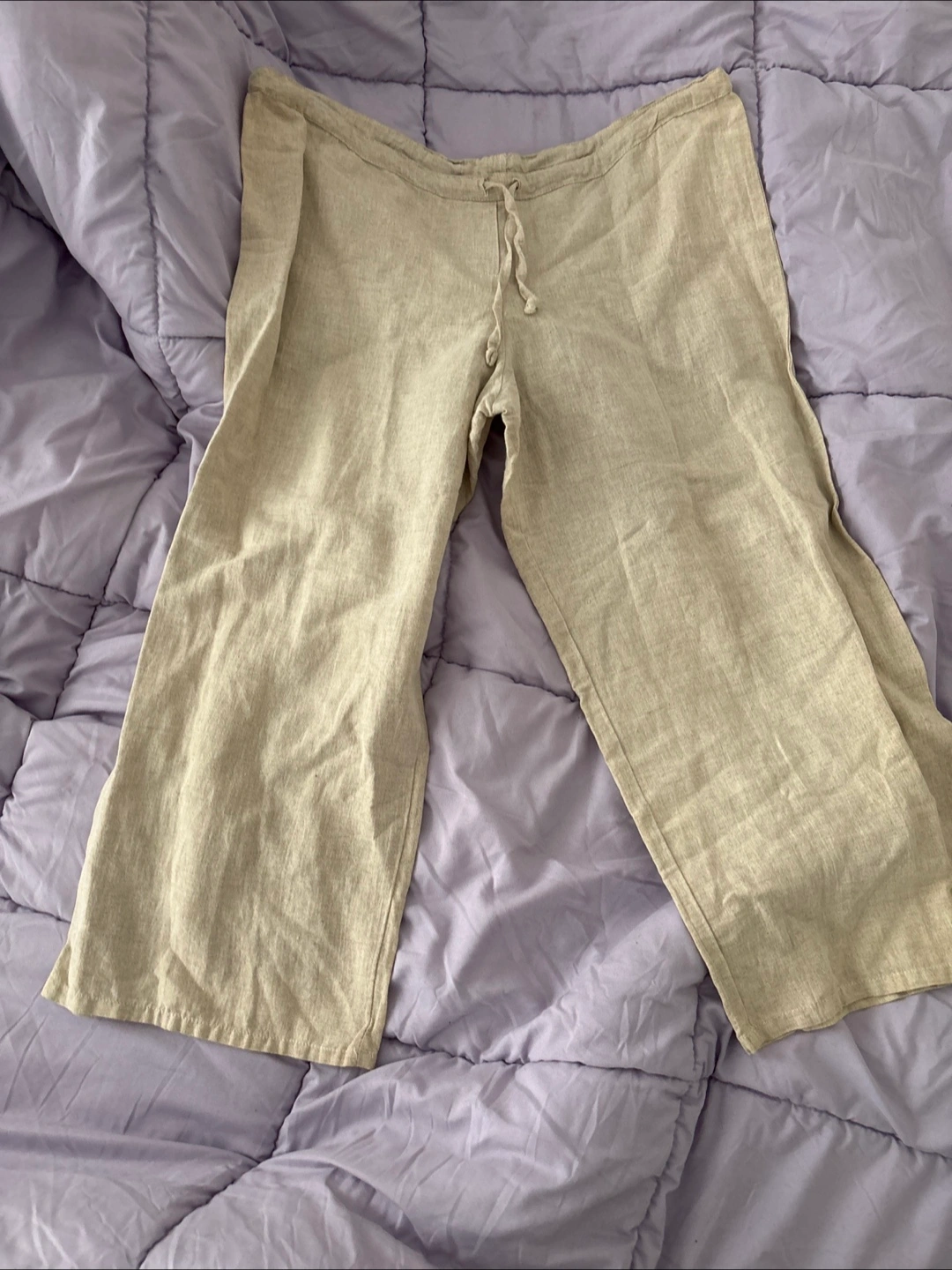 Cream colored linen cropped pants. Drawstring waist. Relaxed fit. Made in the U.S.A.