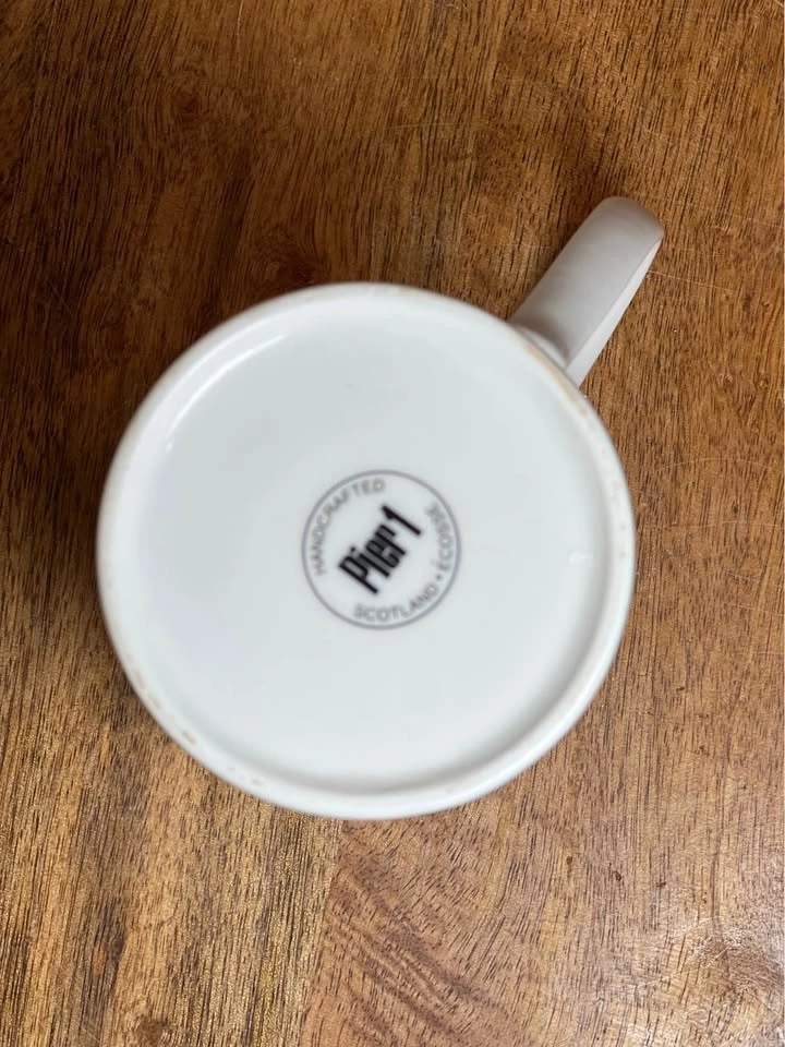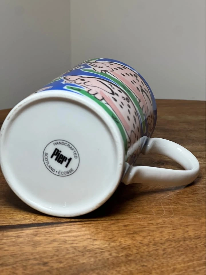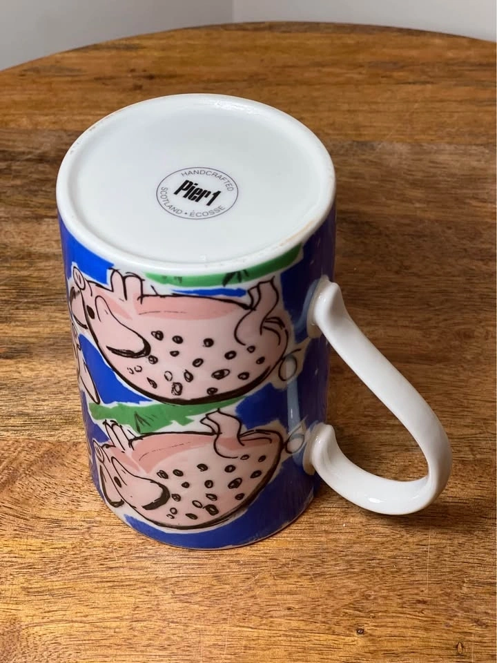 This is a preowned Pier 1 Imports ceramic coffee mug featuring a whimsical, hand-painted style pig design by artist Jane Brookshaw. It's handcrafted in Scotland and part of a series that often includes other farm animals. Pickup is at 58th and 7th Ave in midtown Manhattan.