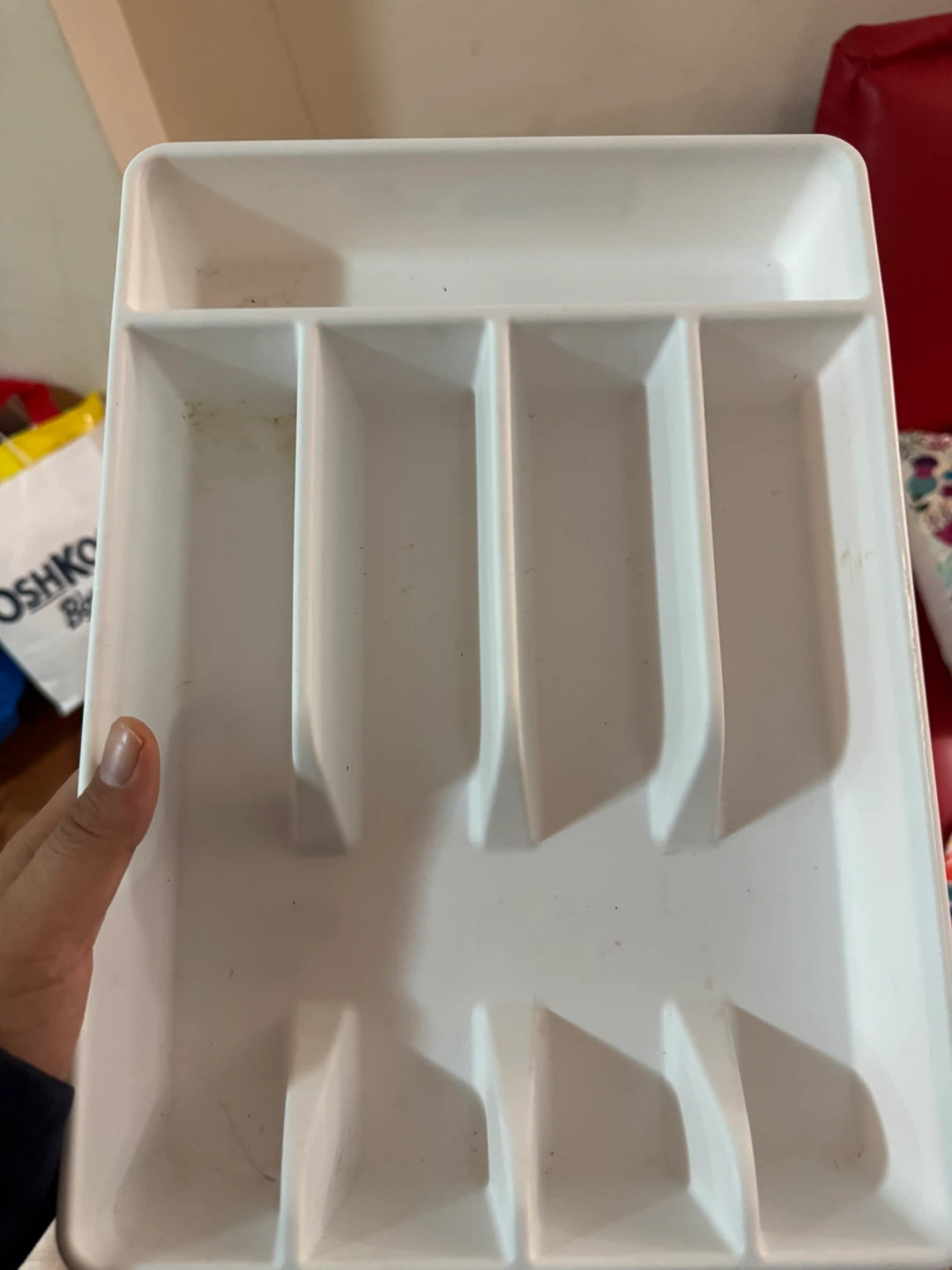 This is a white plastic cutlery organizer tray. It has five compartments for organizing utensils. The tray is made of durable plastic. It's great for keeping your kitchen drawers tidy!