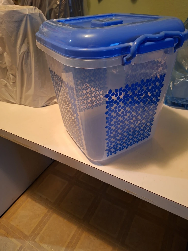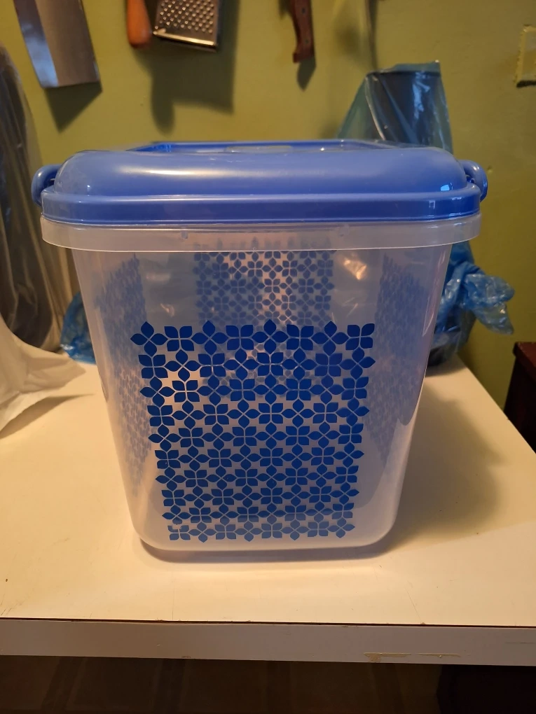 Clear square food storage container with a blue lid. It's made of plastic and features a patterned design inside. Perfect for storing dry goods or leftovers or just to take with you when camping or fishing