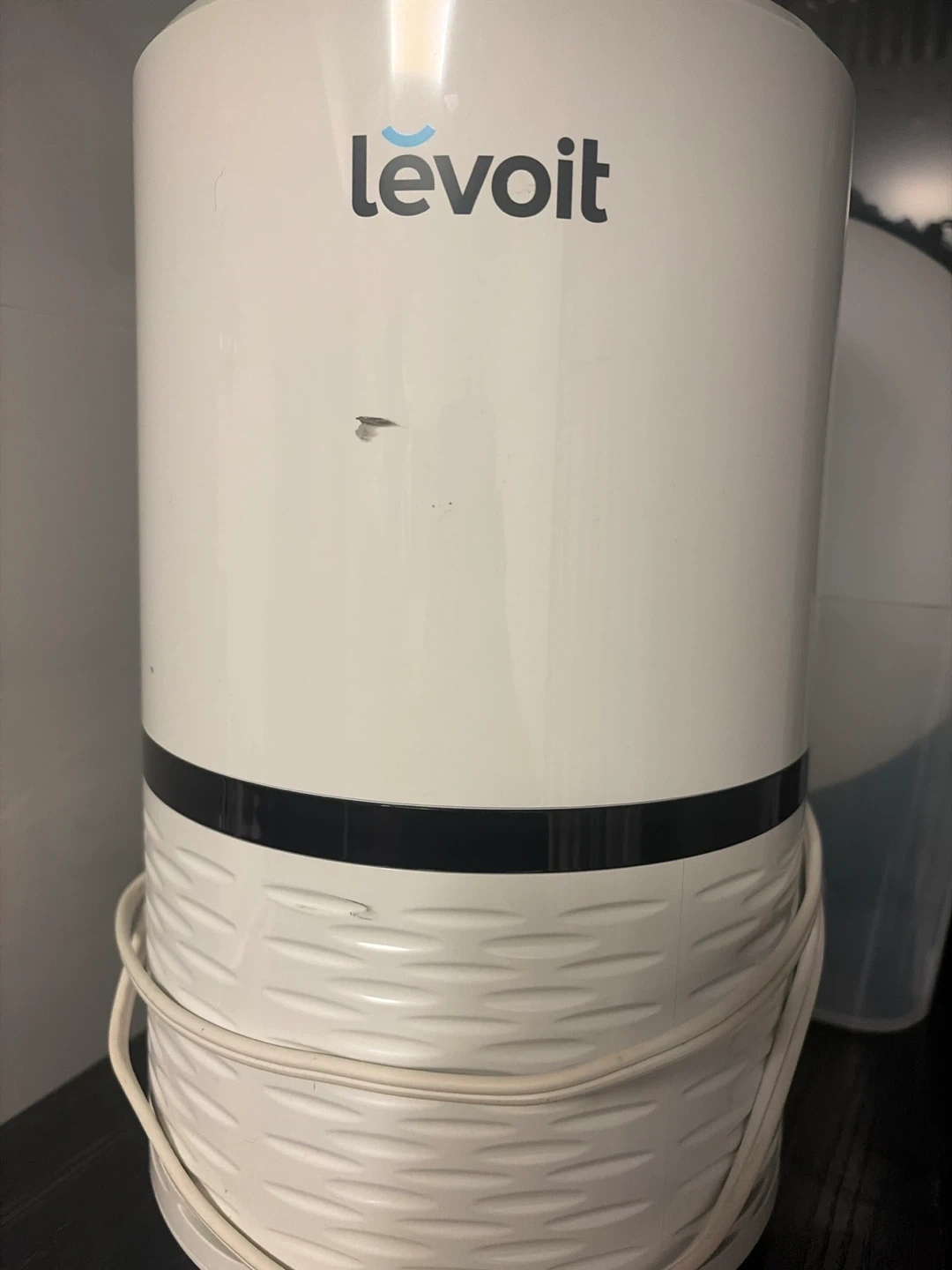 White Levoit air purifier. Includes power cord. This unit is pre-owned with minor scuffs on the exterior. It's ready for a new home!