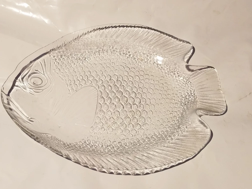 Clear glass serving dish shaped like a fish. It's textured with scales and has raised fins. This dish is made of clear glass.
