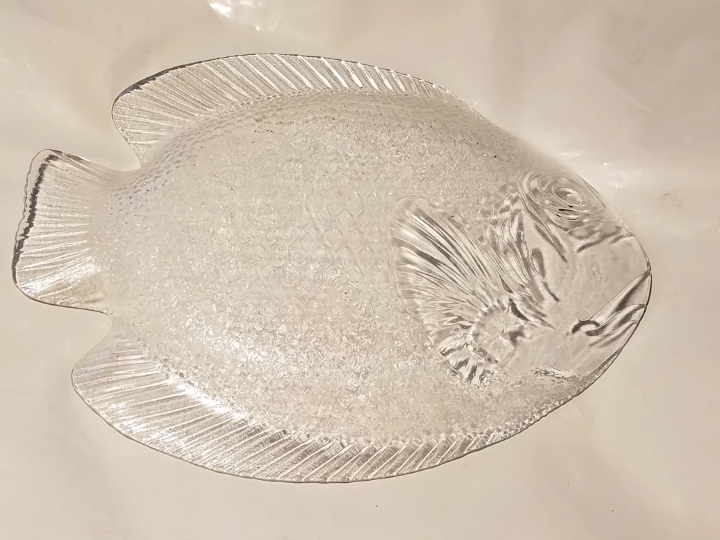 Clear glass serving dish shaped like a fish. It's textured with scales and has raised fins. This dish is made of clear glass.