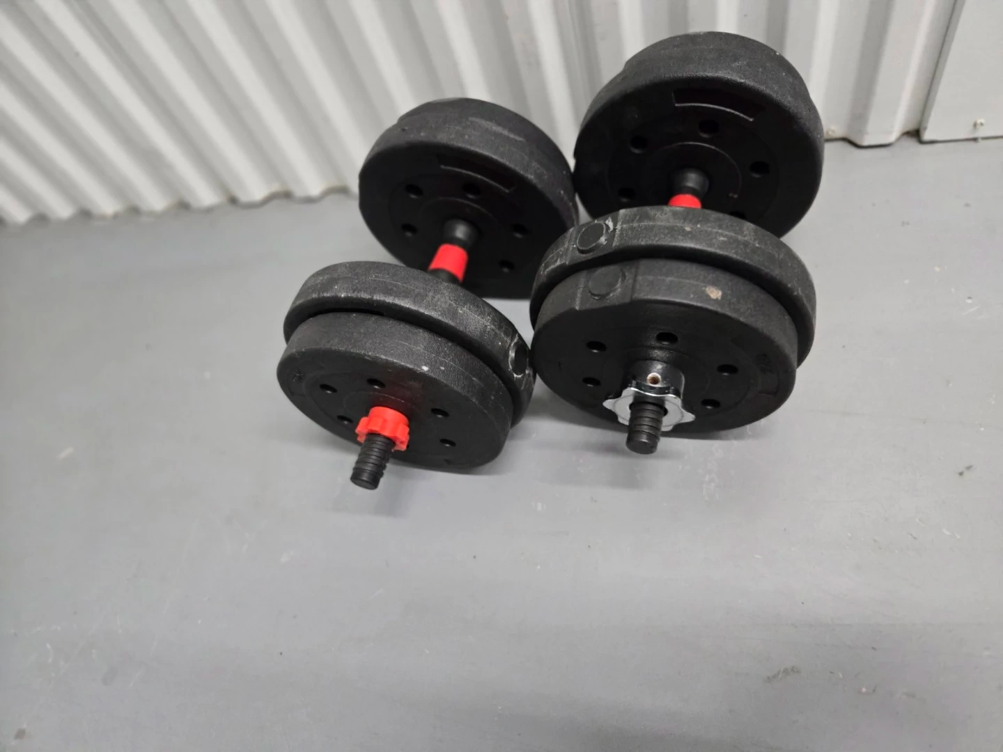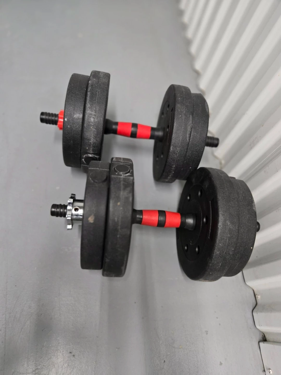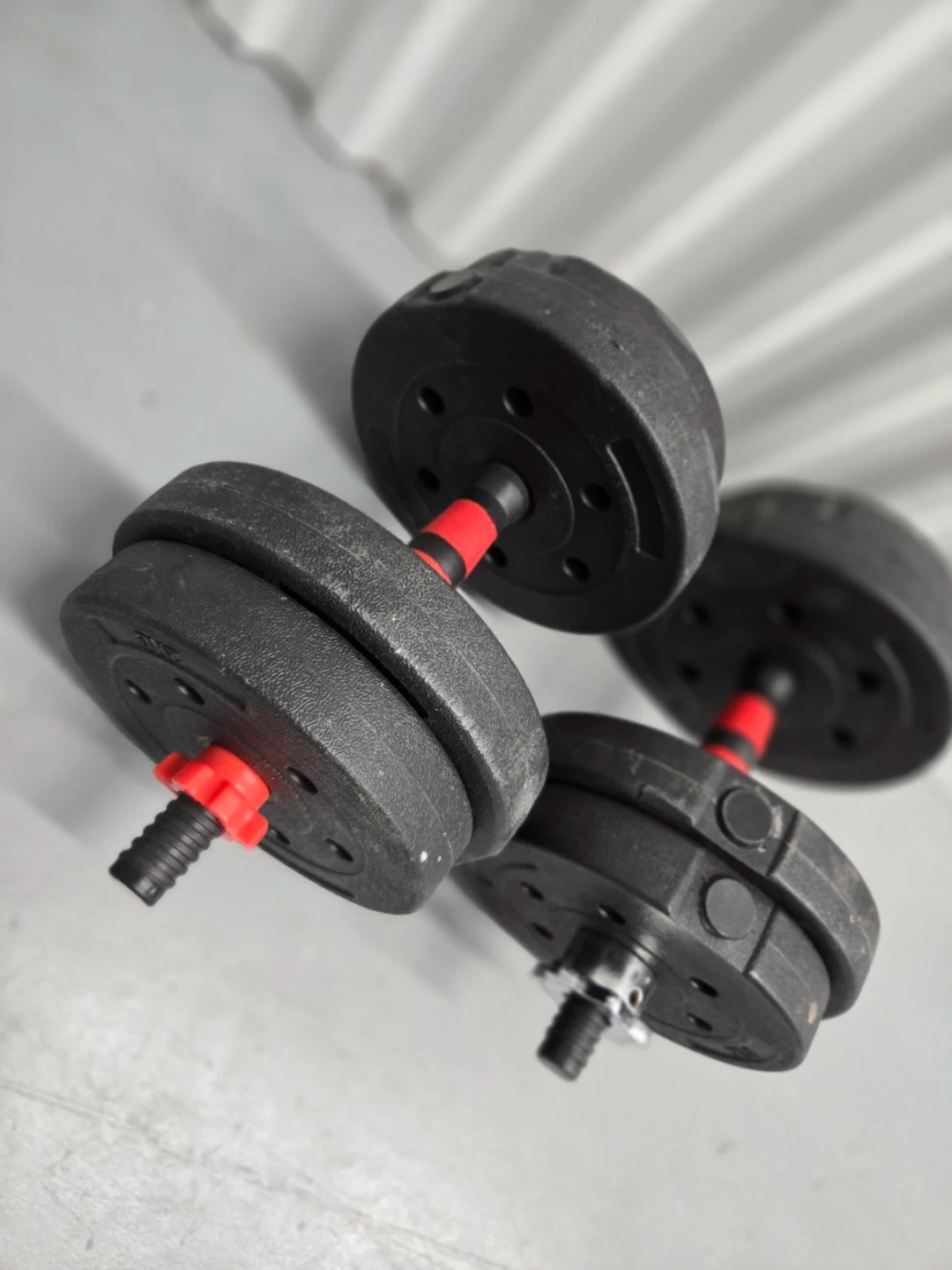 Set of two adjustable dumbbells with black weight plates. Red accents on the handles. Includes spin-lock collars to secure the weights. Weight plates are made of a durable plastic material.