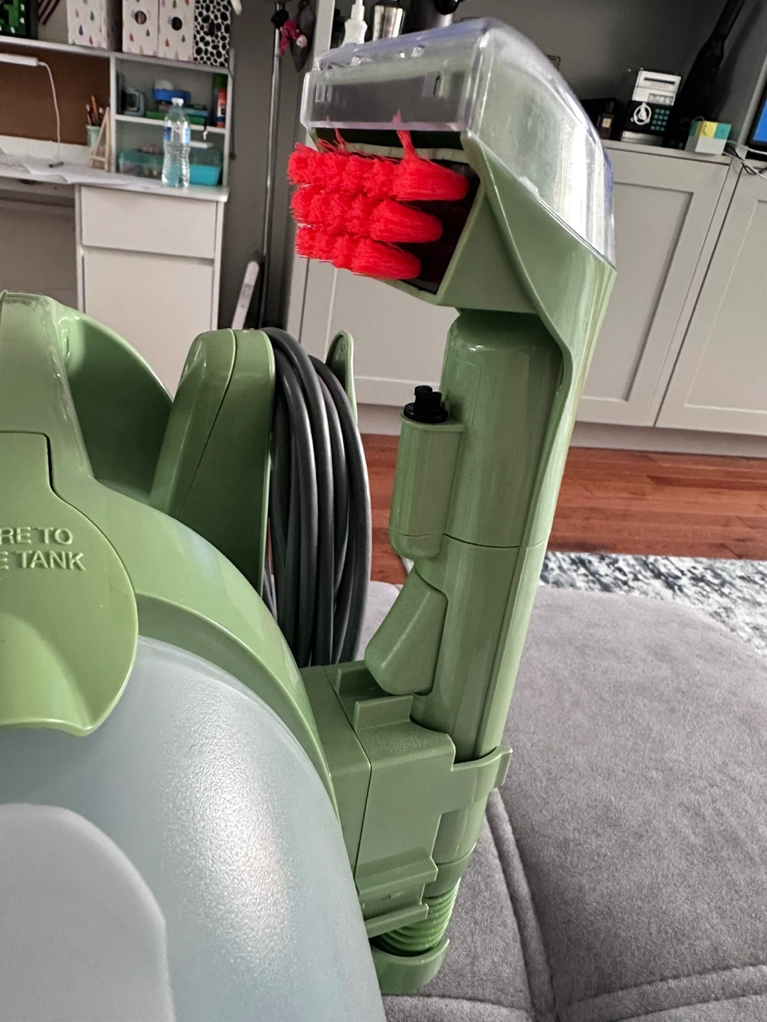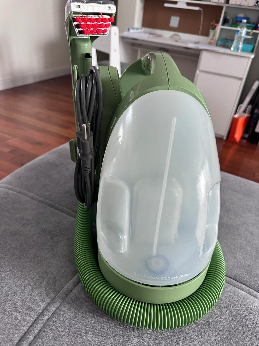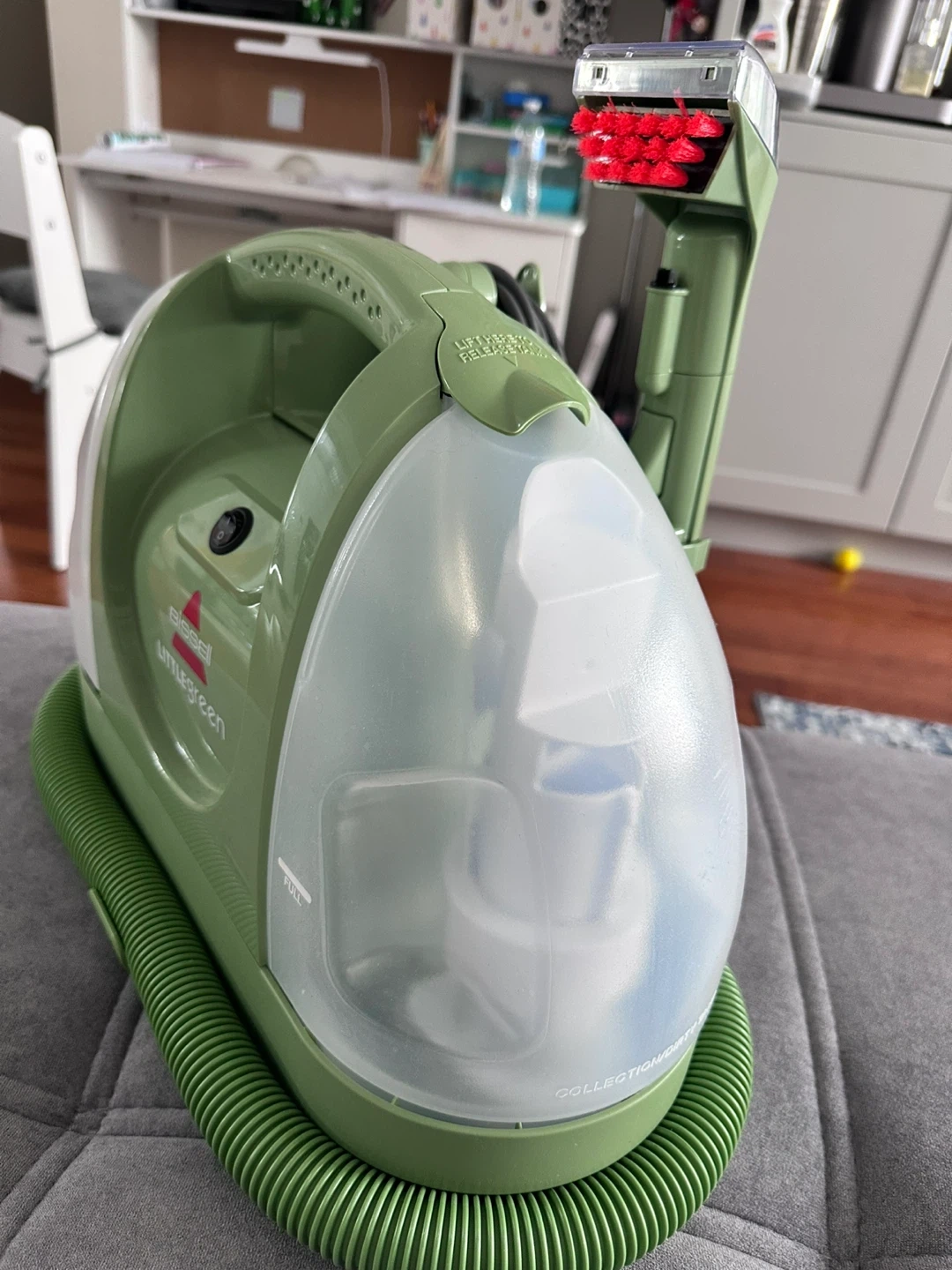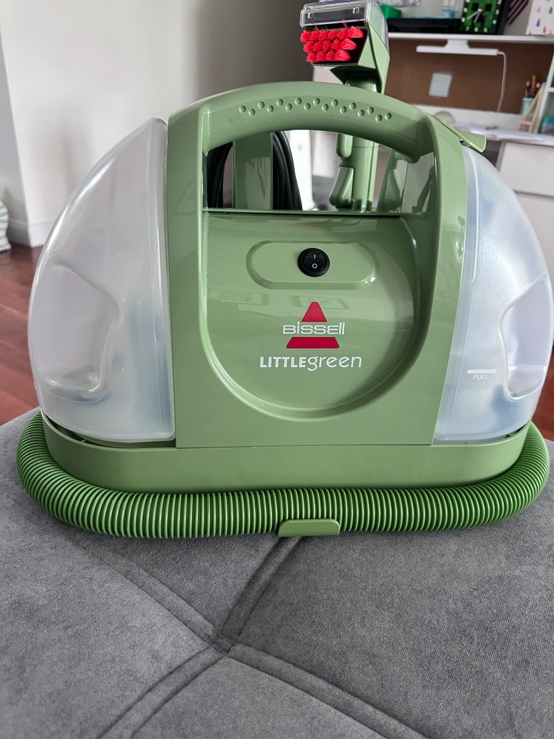 This is a Bissell Little Green portable carpet cleaner. It's designed for spot cleaning carpets and upholstery. Includes the cleaner, hose, and power cord.