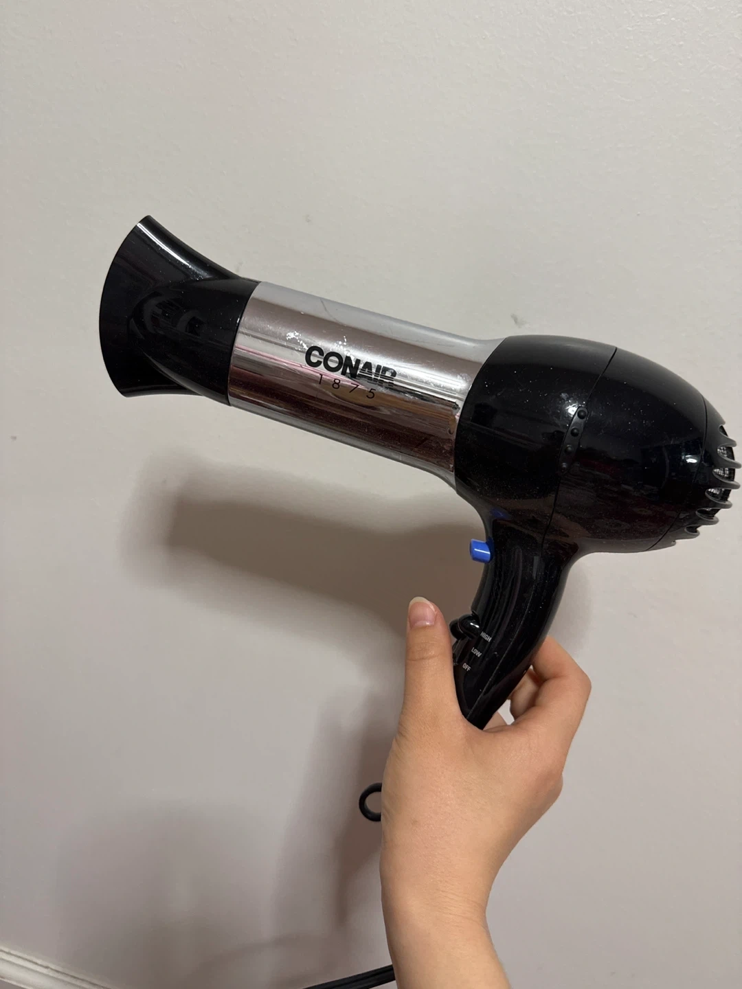 This is a Conair hair dryer with 1875 watts of power. It features multiple heat and speed settings, including cool shot. The concentrator nozzle is included for focused airflow.