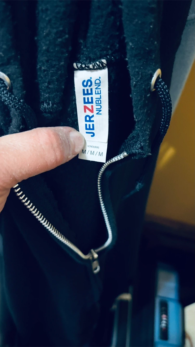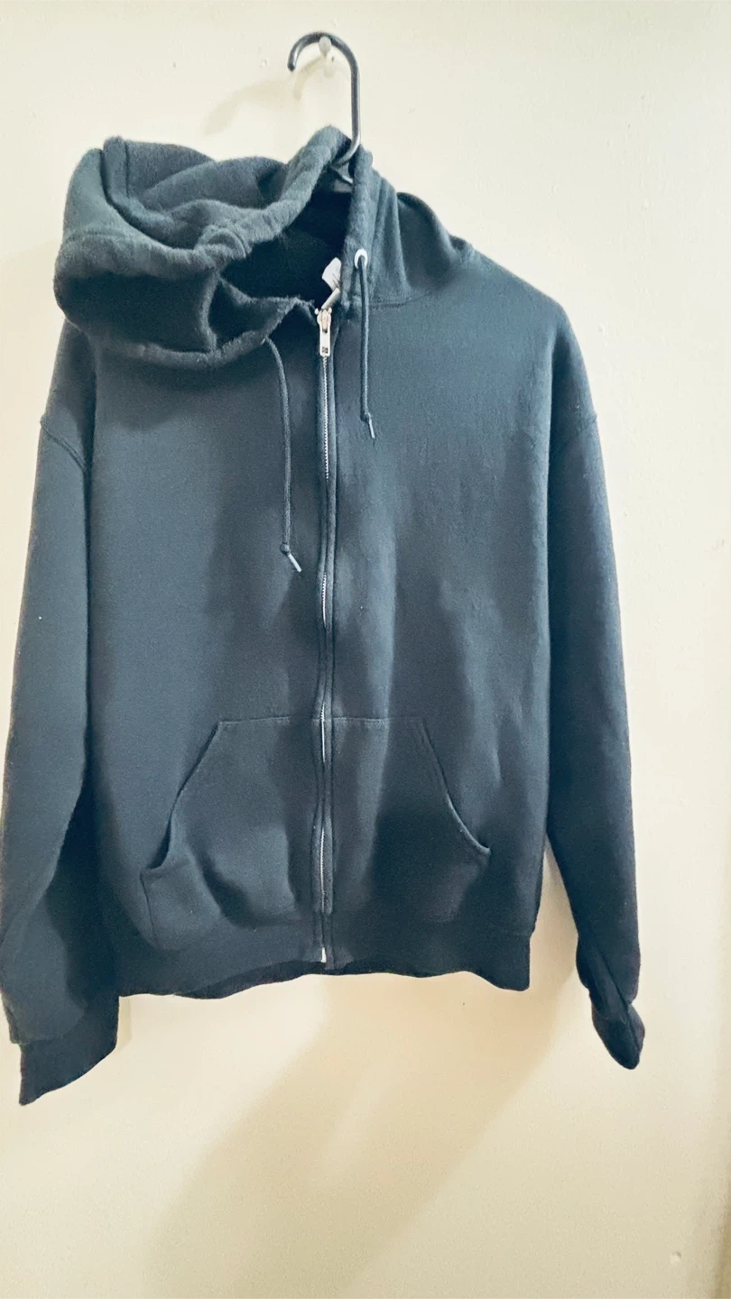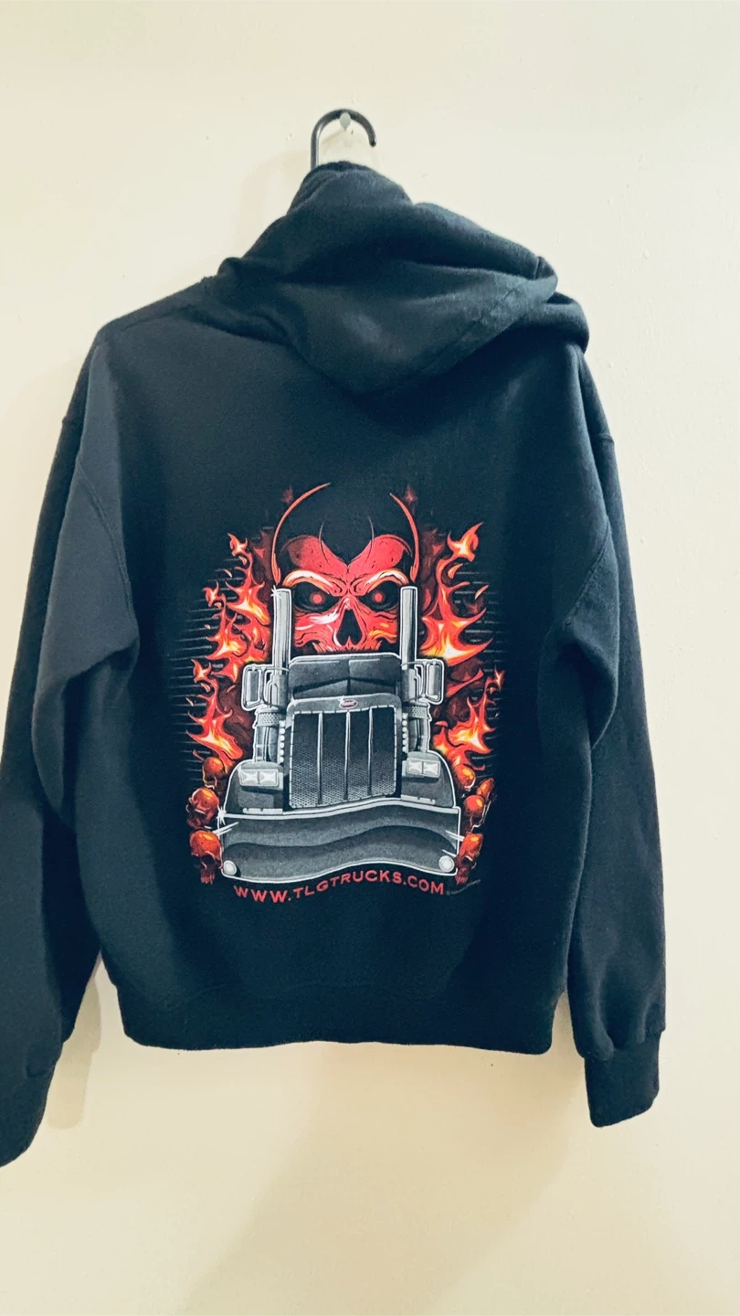 Jerzees Nublend full zip-up hoodie. Features a graphic print on the back with a skull and truck design. Made from a comfortable blend. Size medium. It's perfect for casual wear!