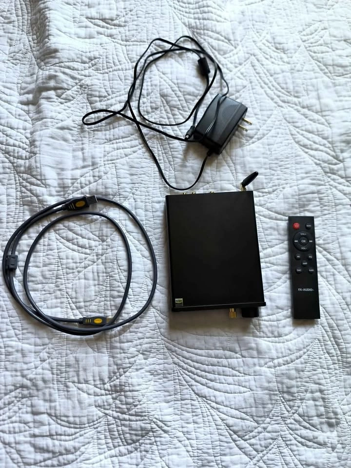 Barely touched USB DAC that works beautifully, comes with all its cables and remote.