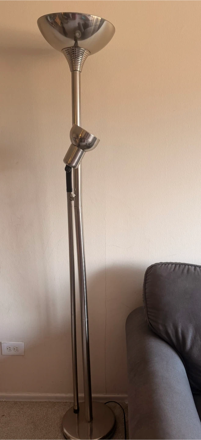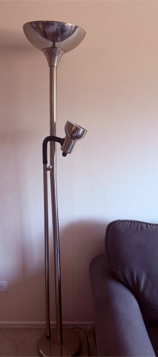 This is a brushed metal floor lamp with an adjustable spotlight. It's a great addition for reading or accent lighting in any room. The lamp has a sturdy base and a tall, slim profile.