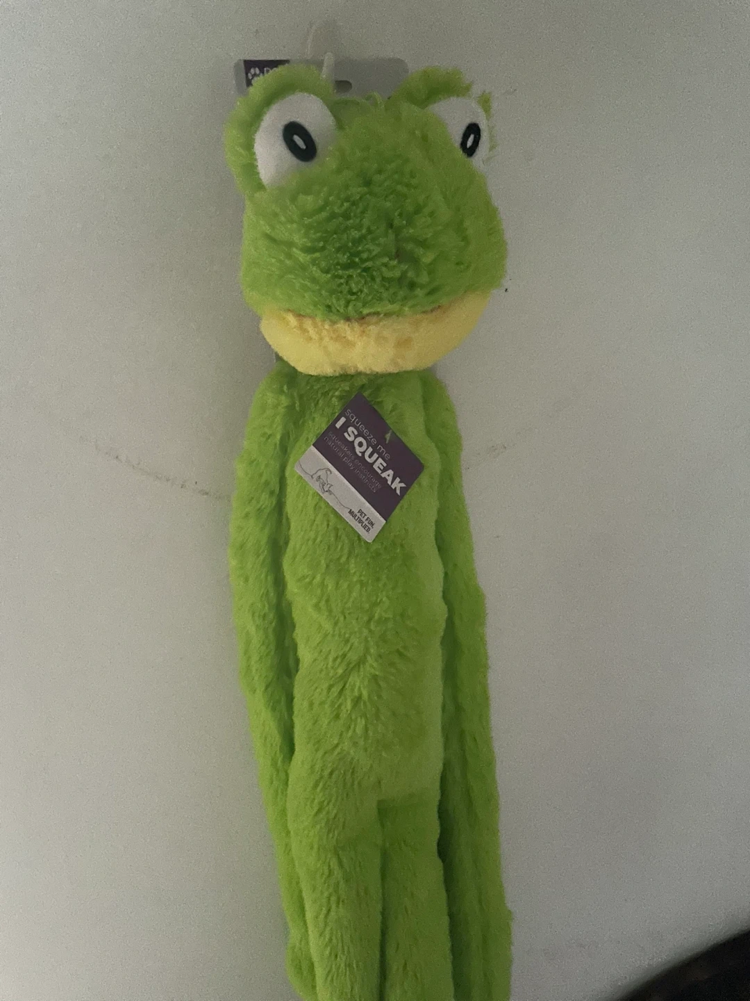 This plush frog dog toy is designed for fun and play. It's made of soft, fuzzy material and squeaks when squeezed to encourage natural play instincts. The bright green color and friendly design make it an appealing toy for pets.