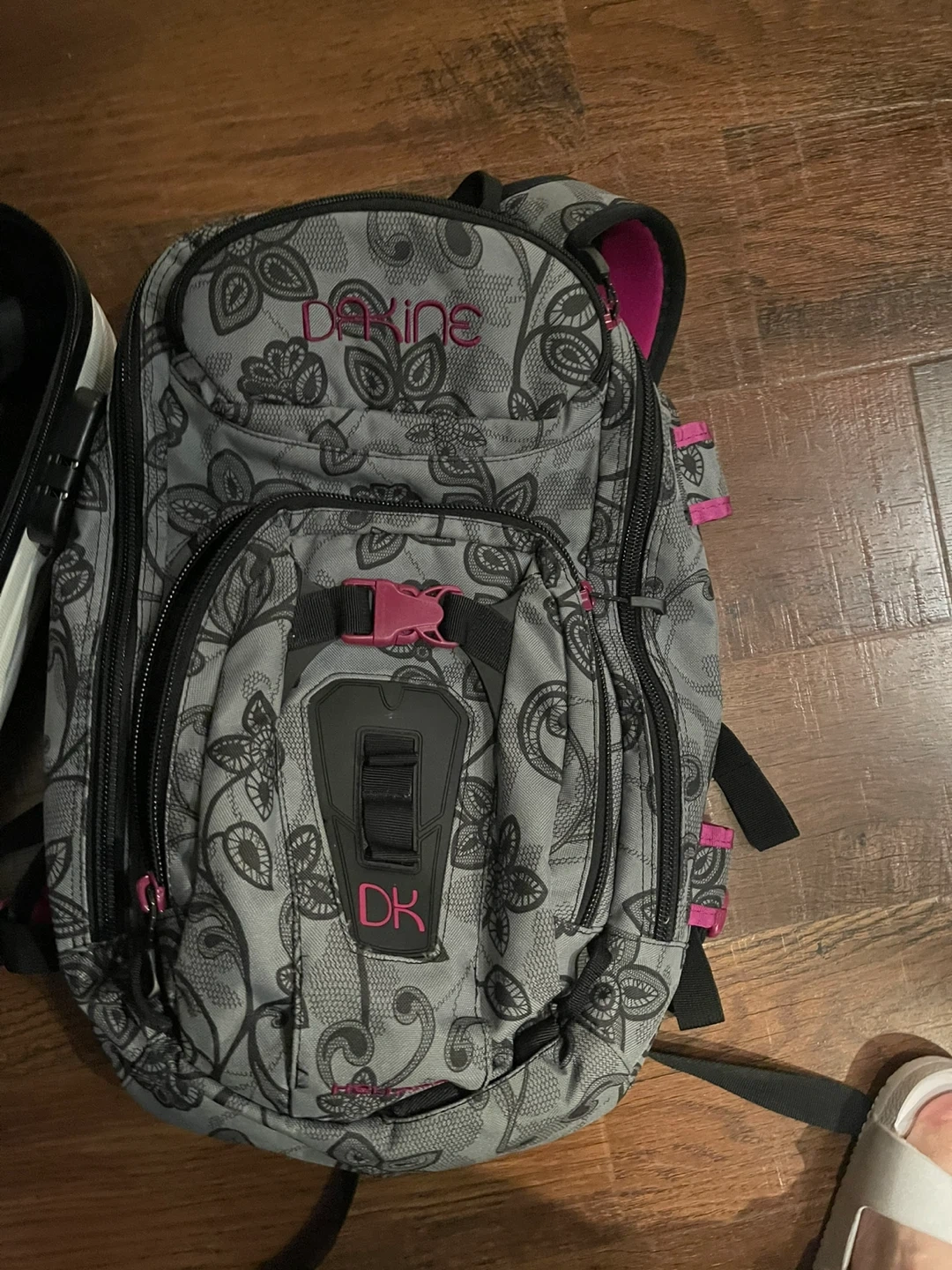 Selling a Dakine backpack in gray with pink accents. It's in good condition and ready for a new owner. Perfect for school, travel, or everyday use!