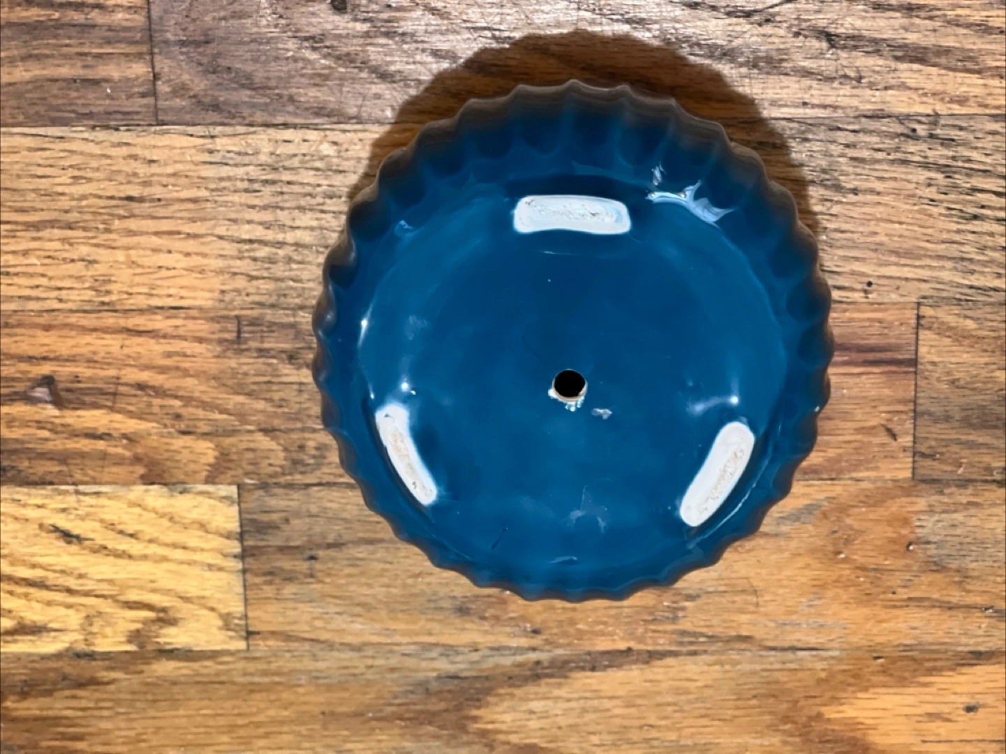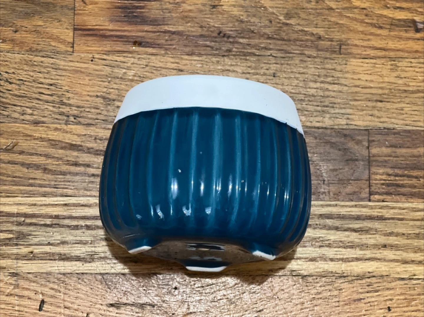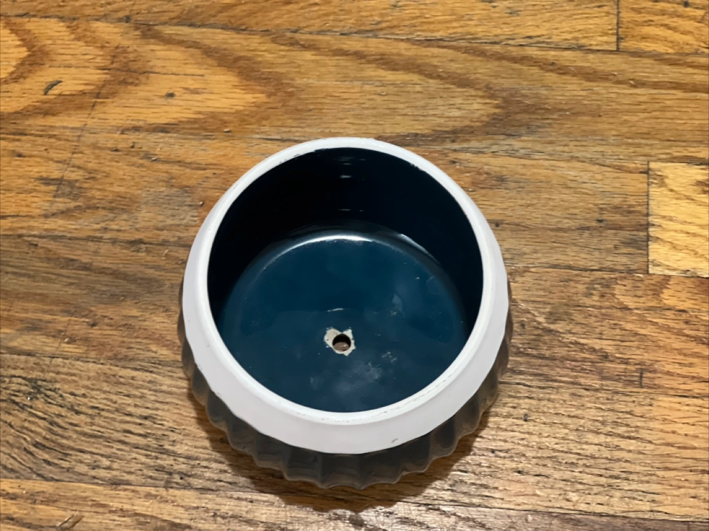Small ceramic planter. Dark blue with white accent. Ribbed design. Drainage hole. Perfect for small plants or succulents.