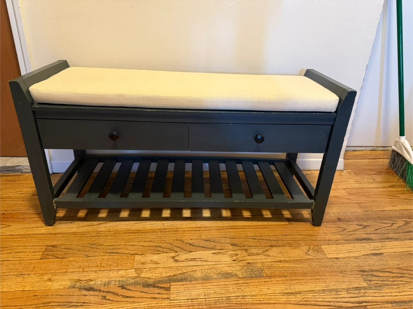 10This is a dark blue entryway bench with two drawers and a shelf underneath. It's perfect for storing shoes and other items. A cushion added on top for extra comfort and style, can be changed