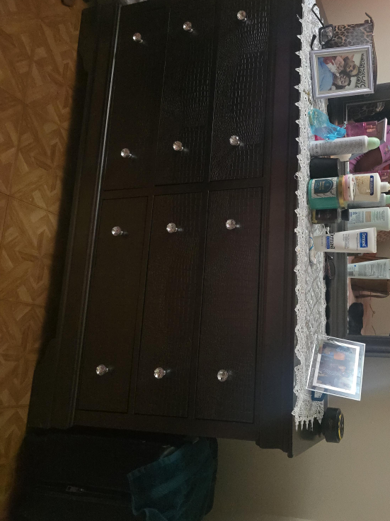 Selling a dark brown dresser featuring a unique crocodile-like texture on some of the drawers. It has elegant crystal knobs that add a touch of sparkle. Perfect for adding storage and style to any bedroom!