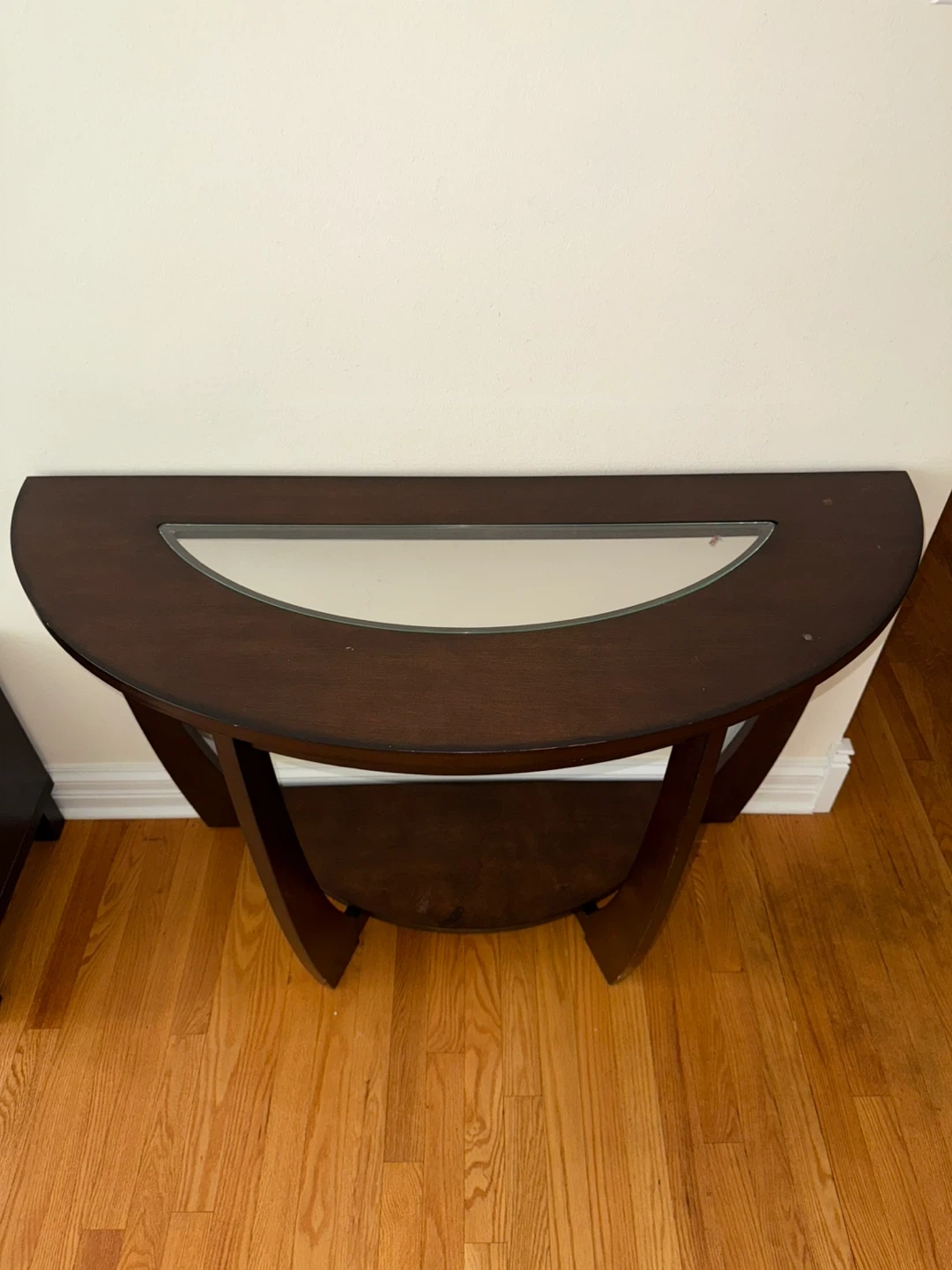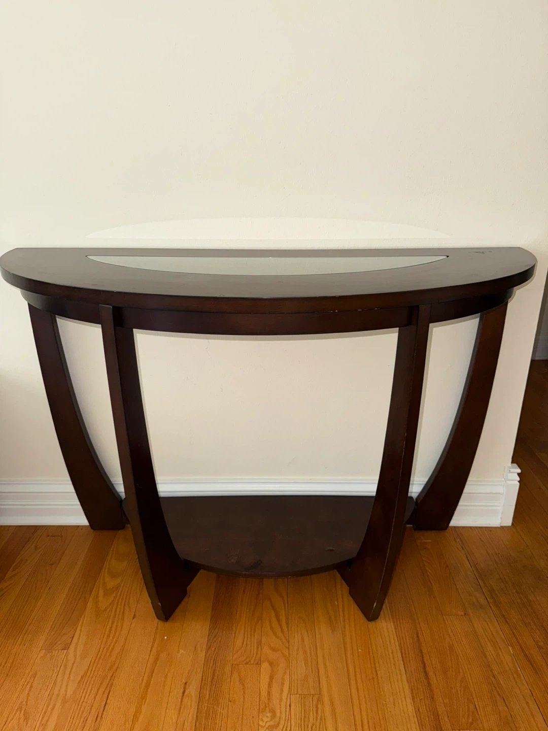 Selling a dark brown half-moon shaped console table. It has a glass top and a lower shelf for storage or display. It's a beautiful accent piece for any entryway or living room! Brand Steve Silver Product Dimensions 16"D x 30"W x 40"H Item Weight 19 Pounds Maximum Weight Recommendation 53 Pounds Frame Material Wood Color Cherry •Merlot Cherry finish •Hardwood Solids, Birch Veneer, Cracked Glass Insert •Contemporary Style •Bottom Display Shelf •Beautiful cracked glass insert •Soft flowing shapes •Brown color complements a variety of interior styles and color schemes New Table website: https://a.co/d/0CGjy5v