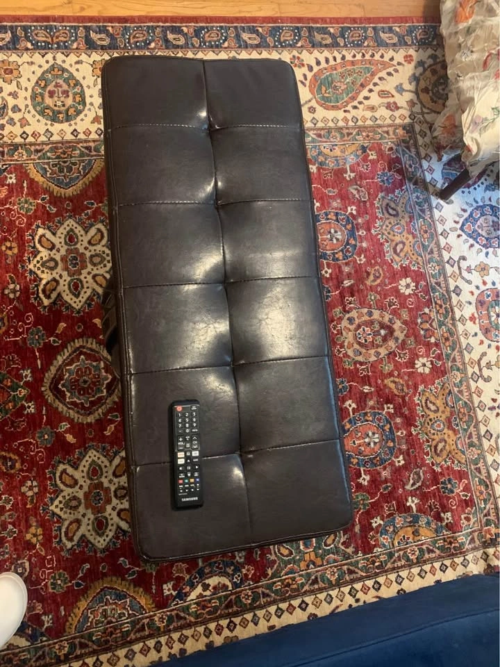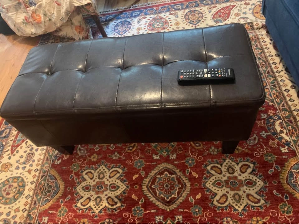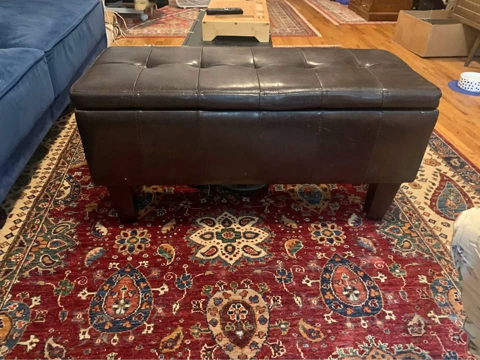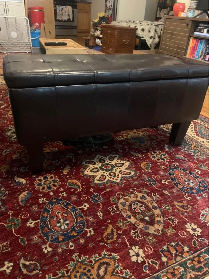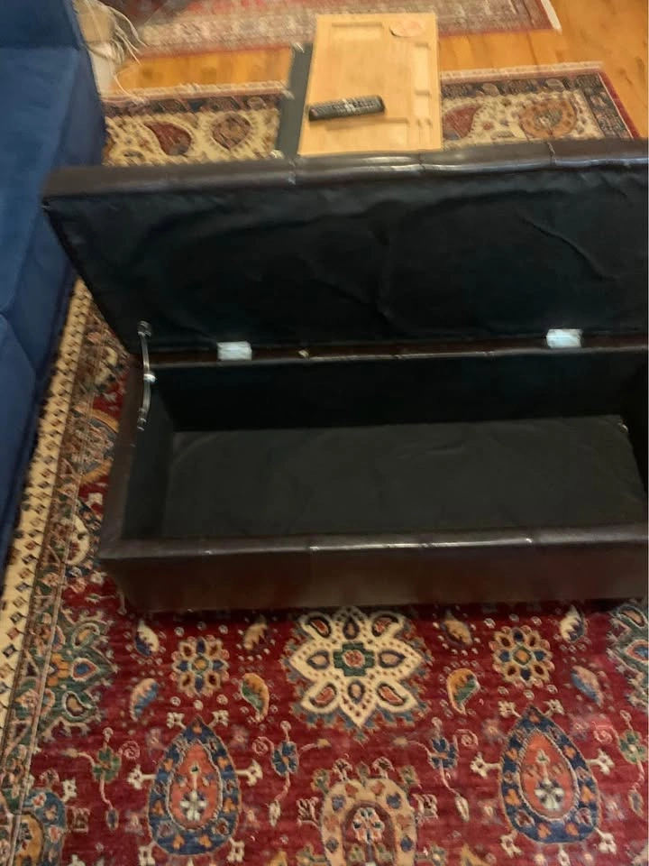 65Brown leather ottoman - multifunctional. With storage! Could be used as a coffee table, in an entryway for seating and shoe storage, add some pillows for a reading nook. I’ve been using it for blanket storage. Let me know if you're interested!