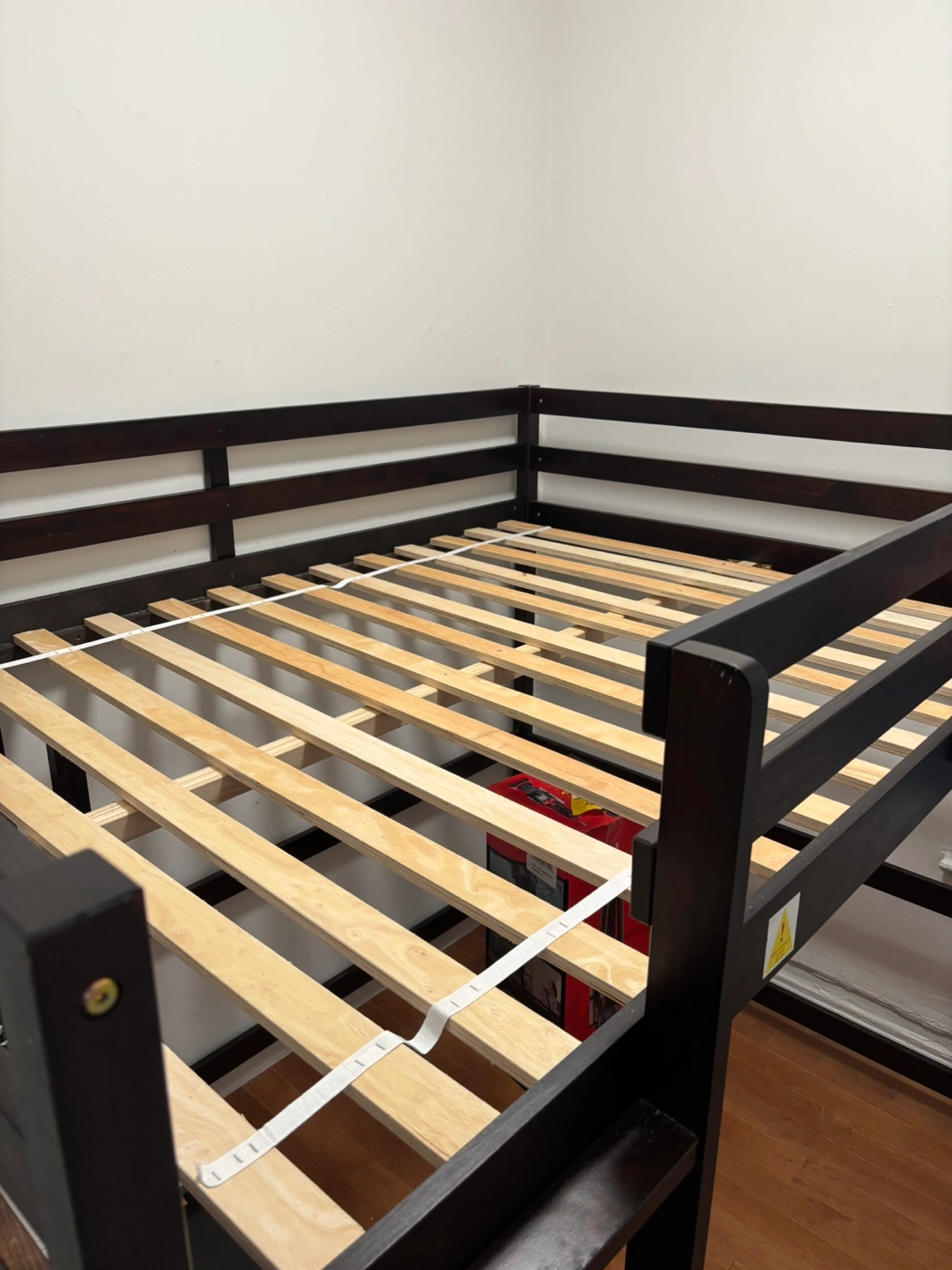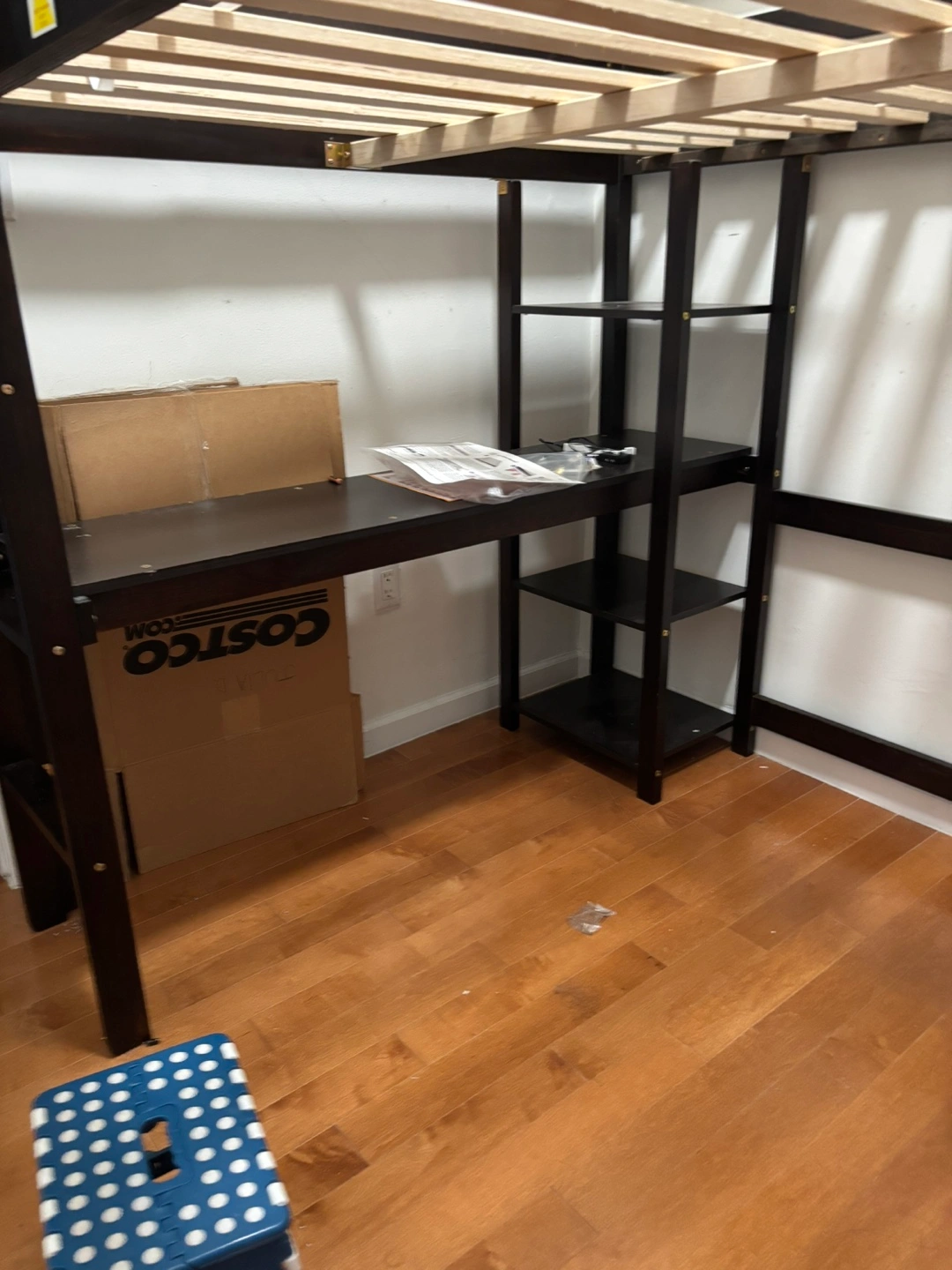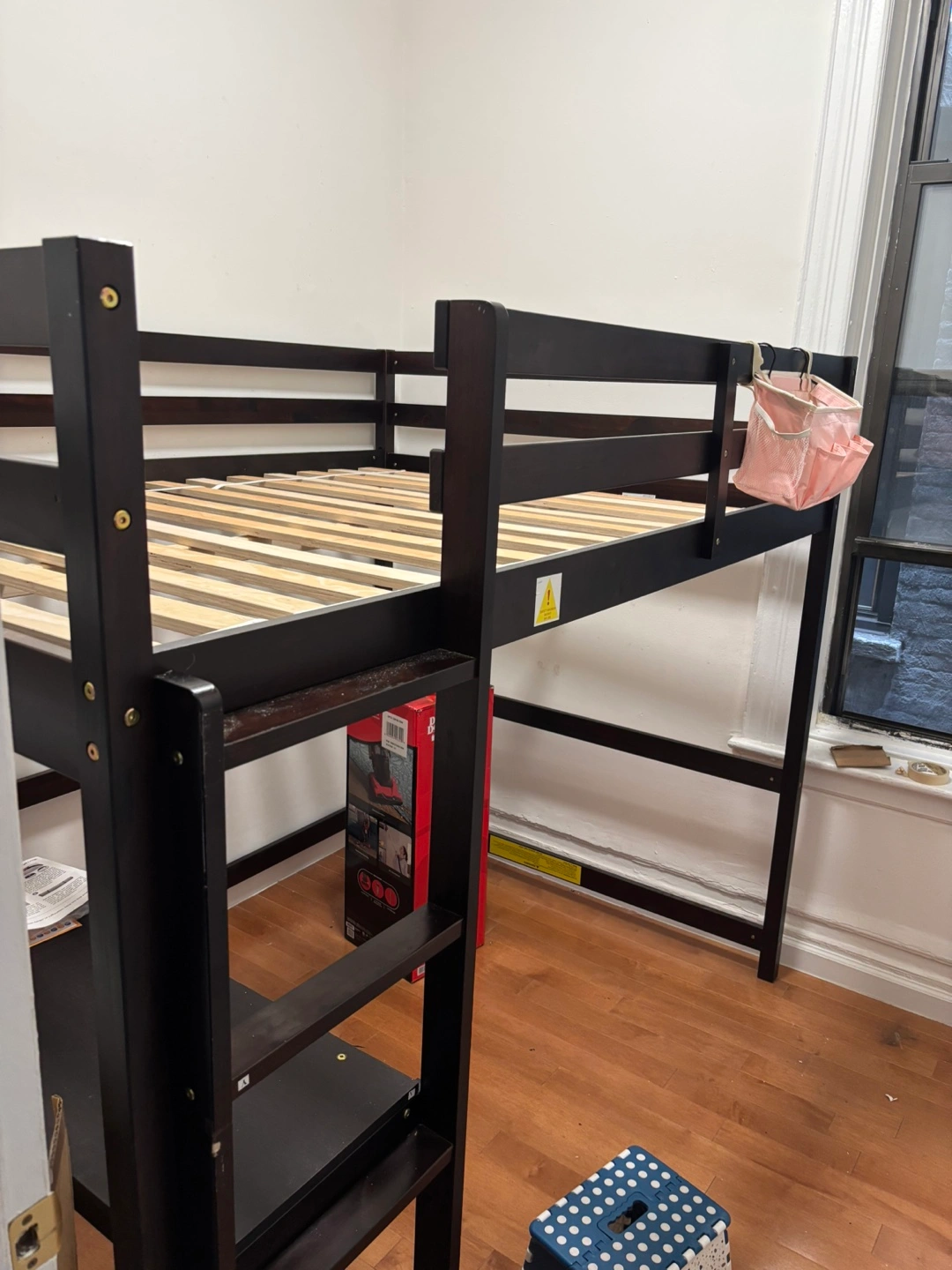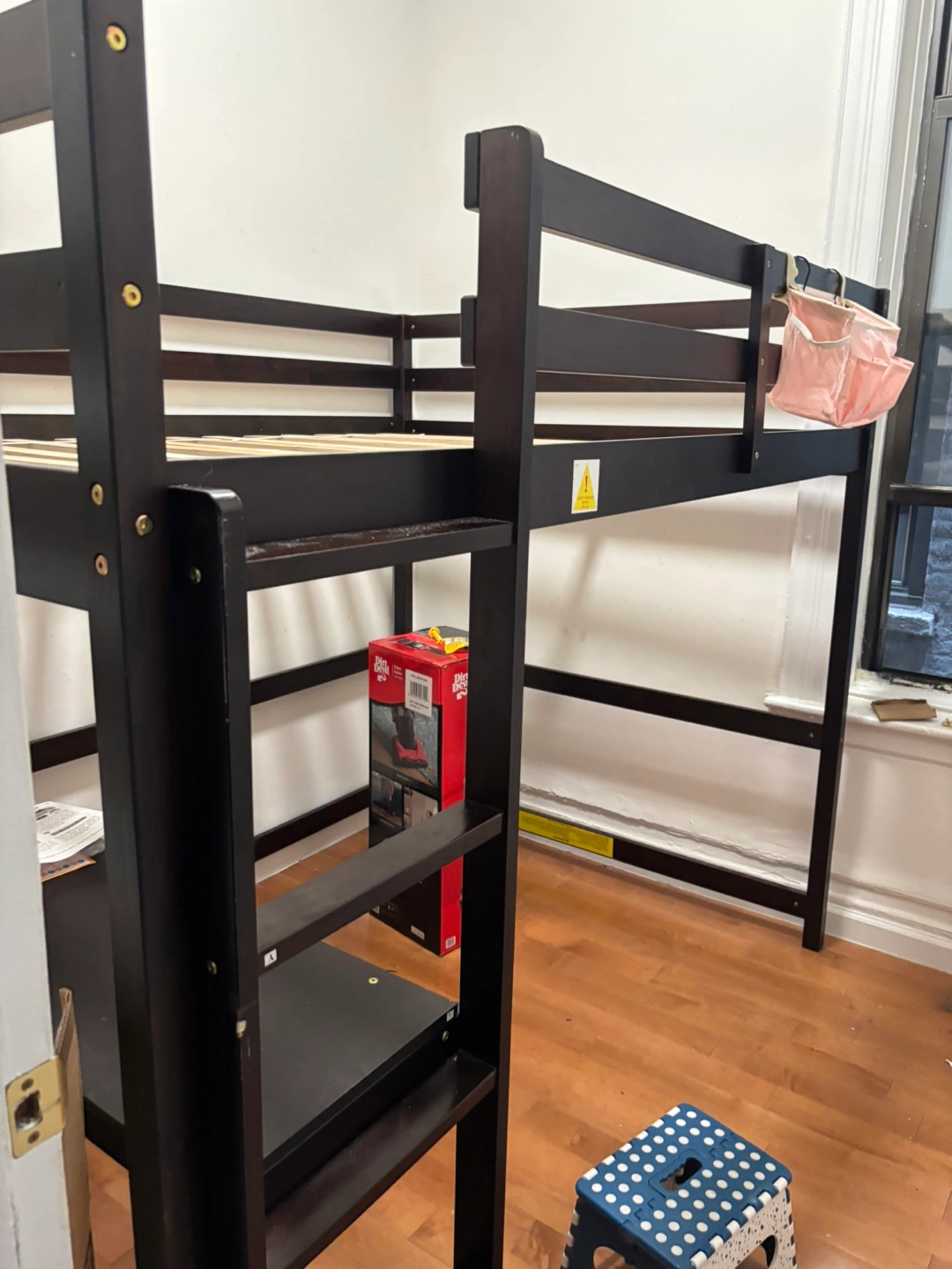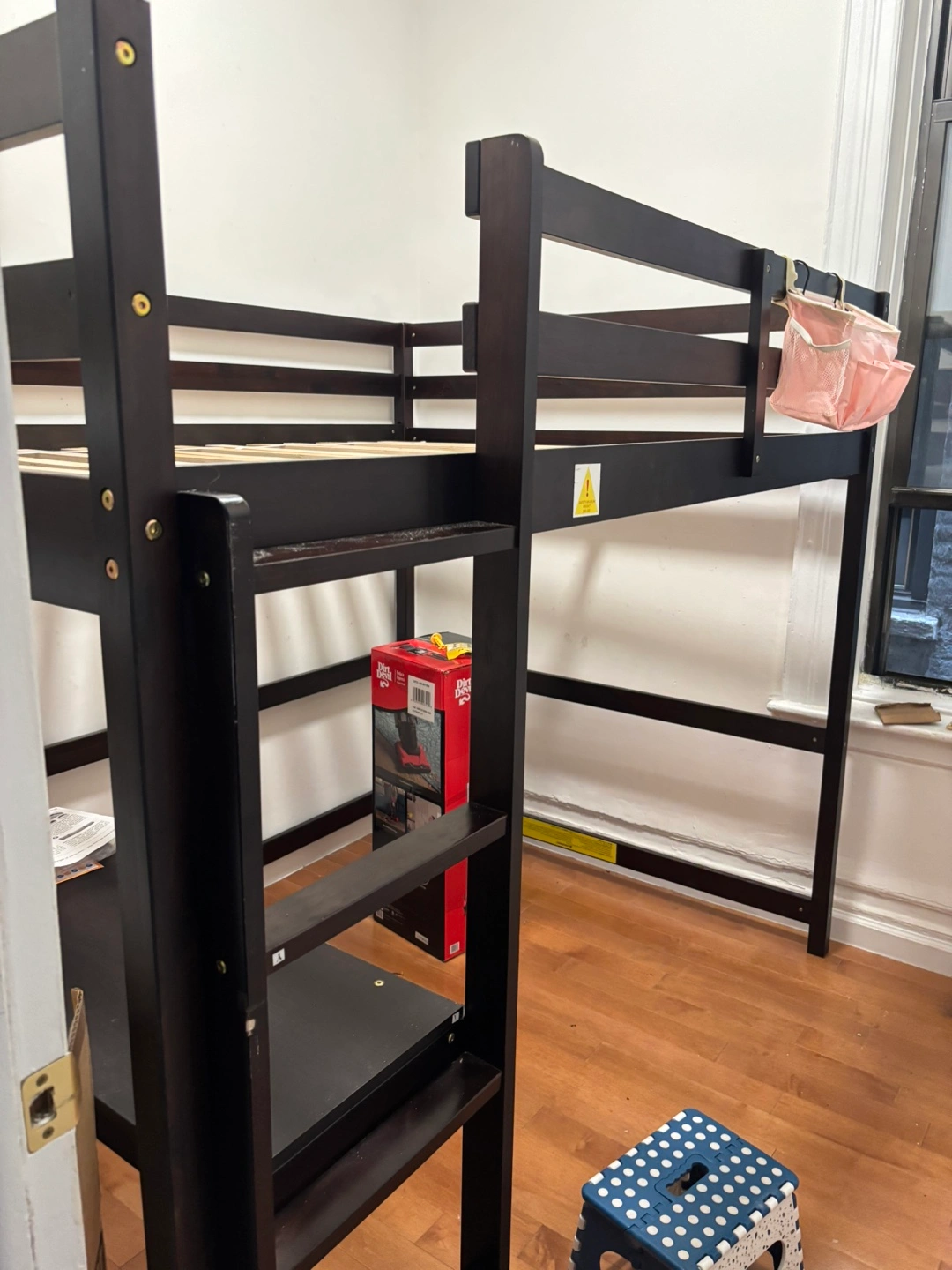 Selling a dark brown loft bed frame that comes with a built-in desk. It's in good condition and perfect for saving space in a bedroom or dorm room. The desk provides a convenient study area, and there is even a bookshelf. Located in Hells Kitchen