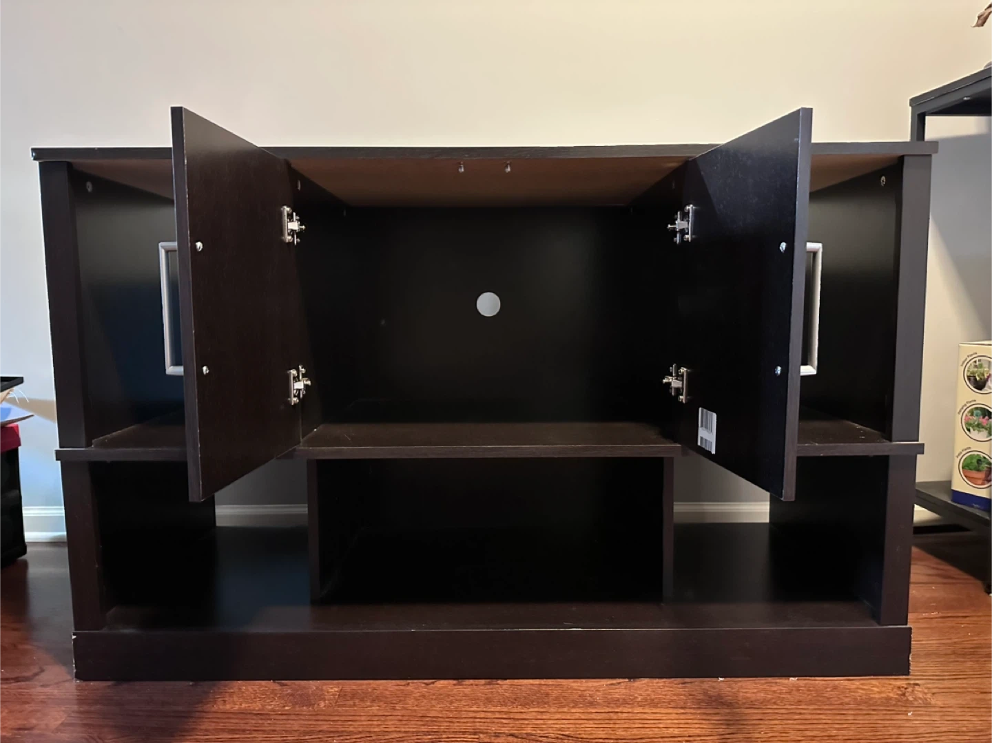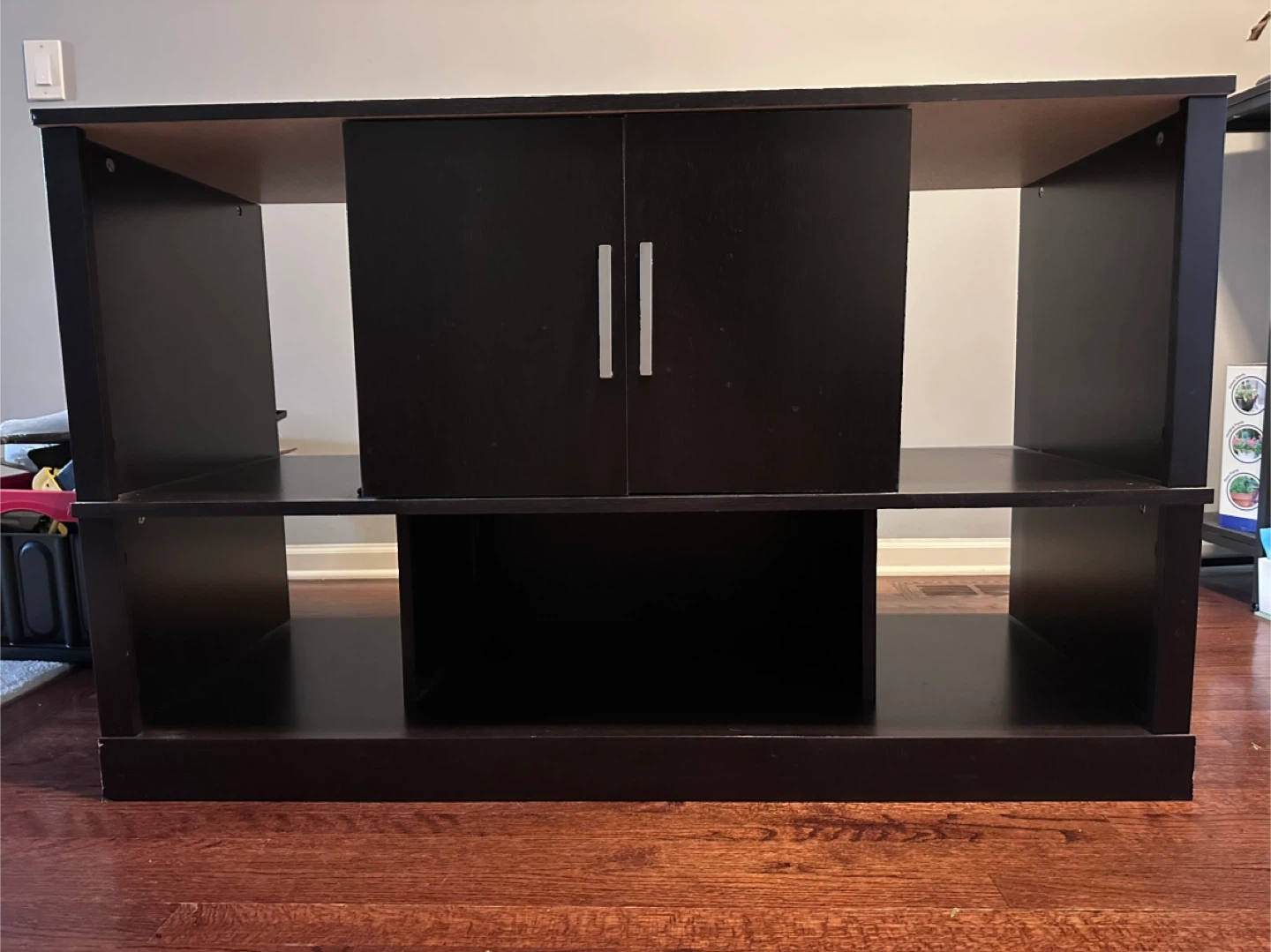 Selling a dark brown media console, perfect for your living room or entertainment area. It features a cabinet in the center for storage and open shelving on the sides. It's in good condition and ready for a new home
