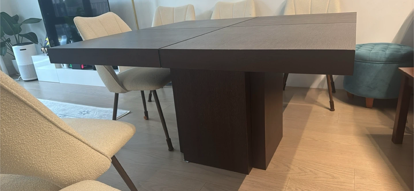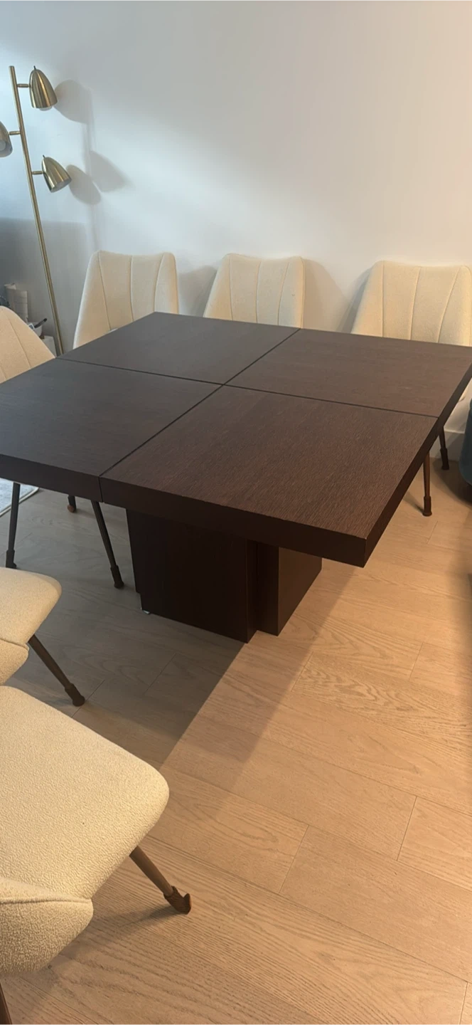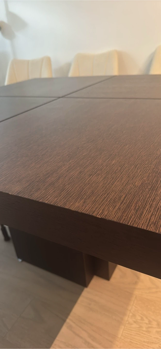 Selling a dark brown square dining table in good condition. It's a sturdy piece that would look great in any dining room or kitchen area. The table comfortably seats 8 people and has a modern, minimalist design