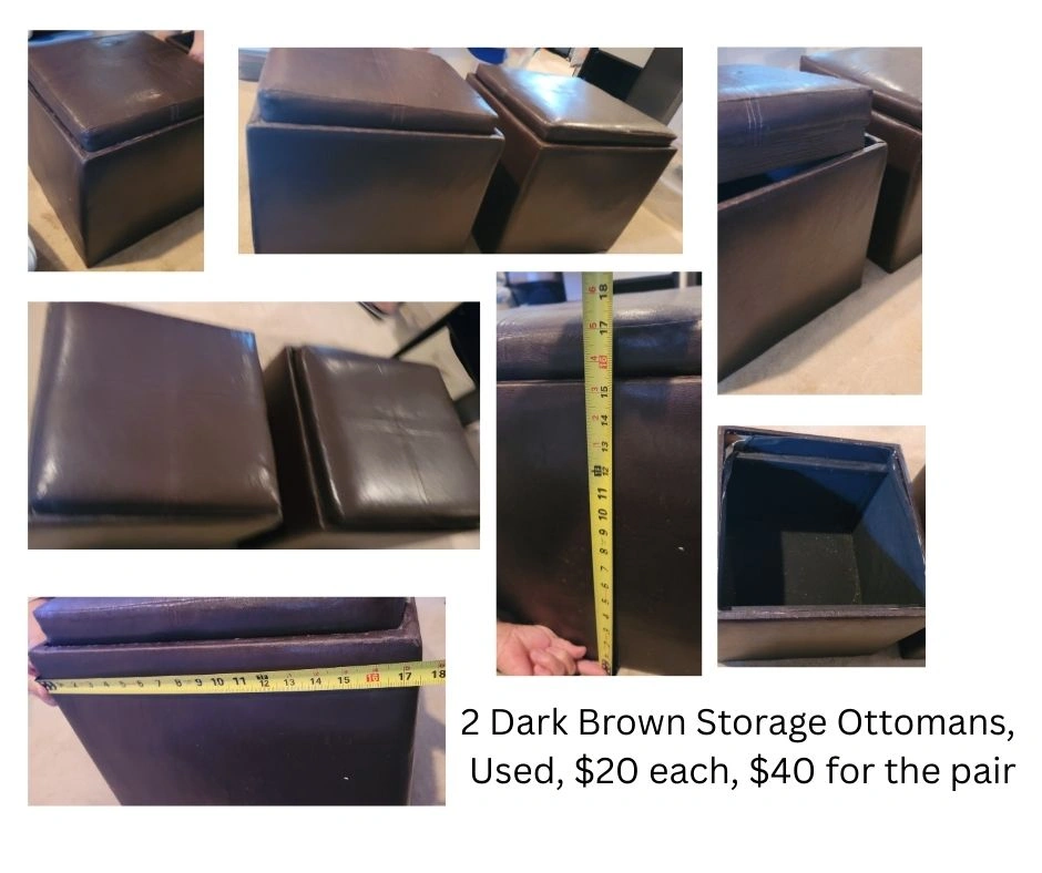 Selling a pair of dark brown storage ottomans! They're used but still in good shape. Each ottoman provides extra seating and storage space, perfect for any room. Dimensions are approximately 17-18 inches. $20 each, $40 for the pair