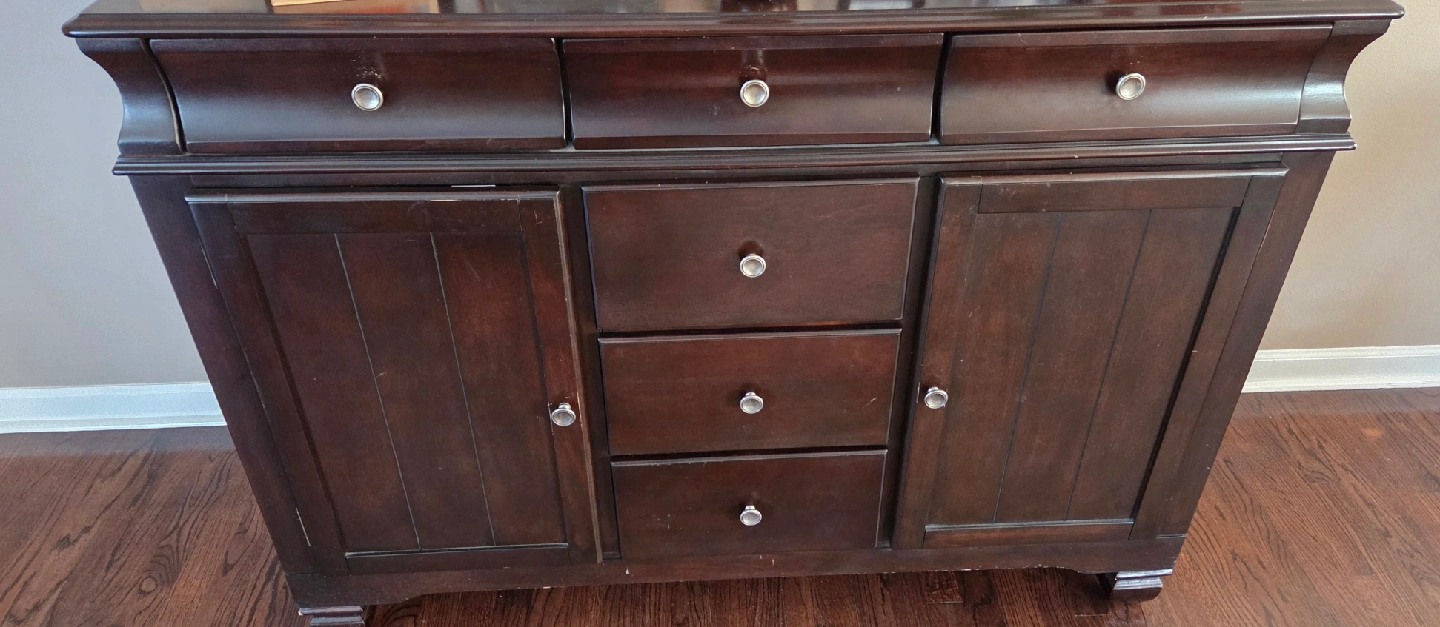 This is a lovely dark brown wood buffet cabinet with plenty of storage. It features drawers and cabinets, perfect for organizing your dining room or living room items. It does have some minor scratches.