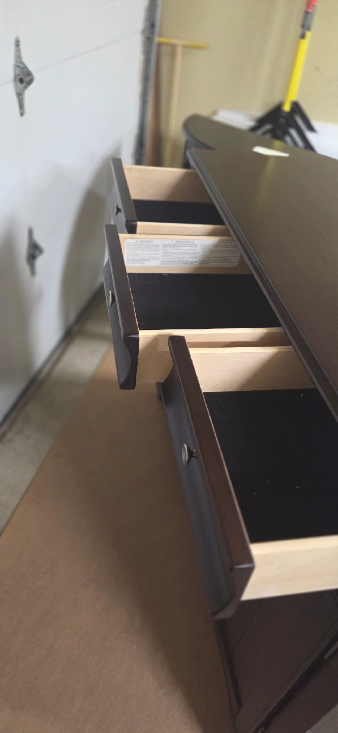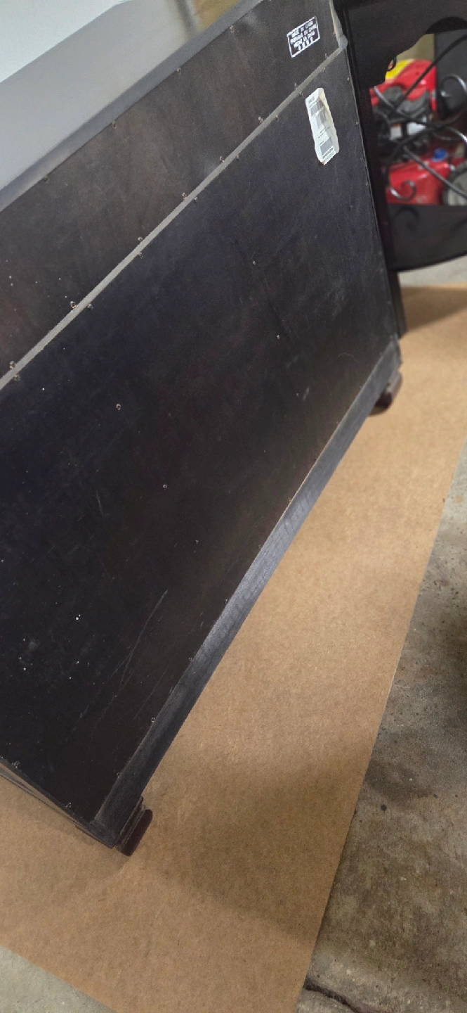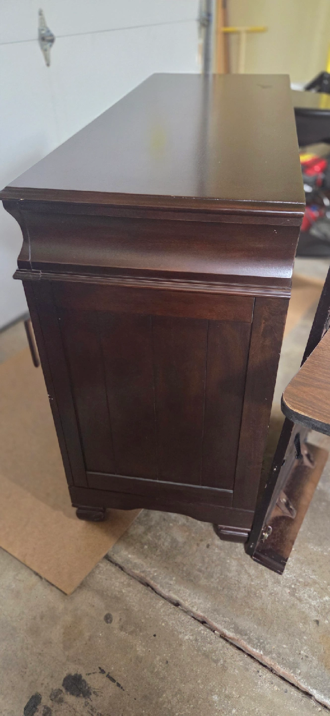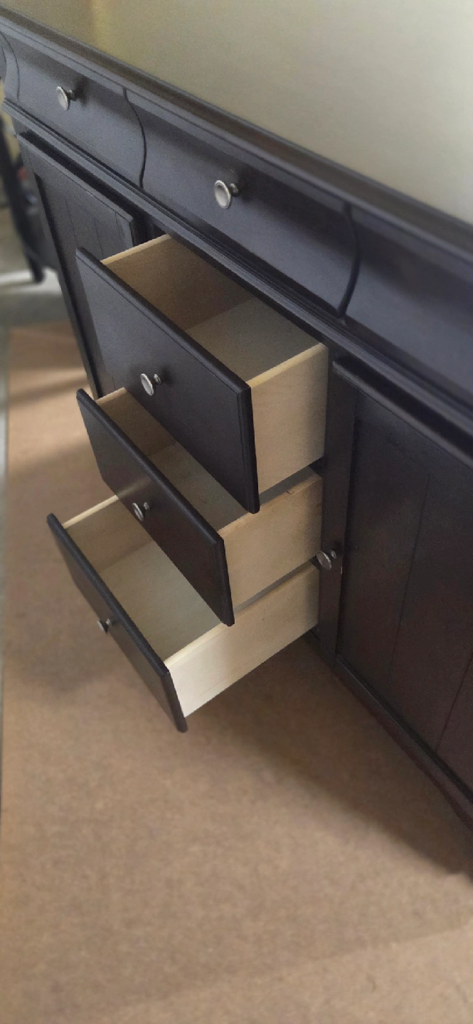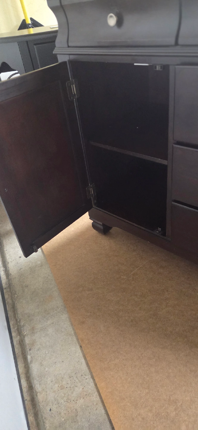 This is a lovely dark brown wood buffet cabinet with plenty of storage. It features drawers and cabinets, perfect for organizing your dining room or living room items. It does have some minor scratches. 51 x 21x 38