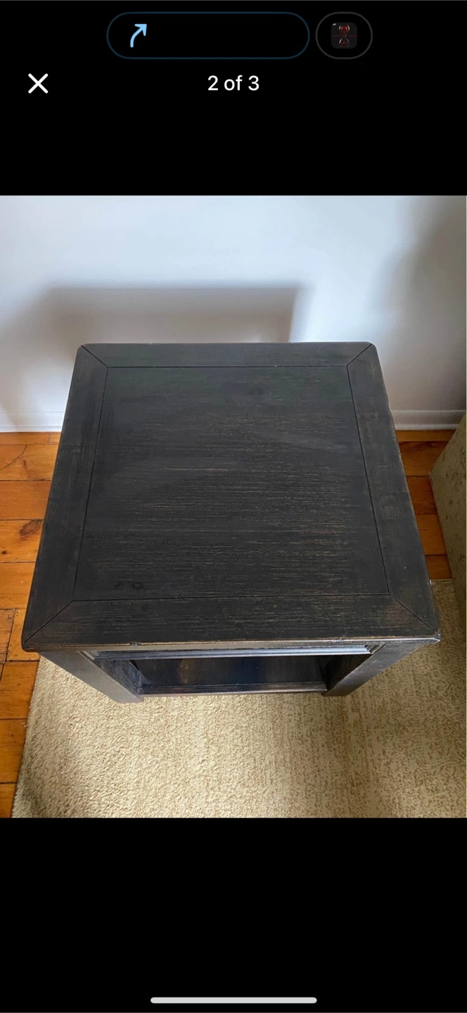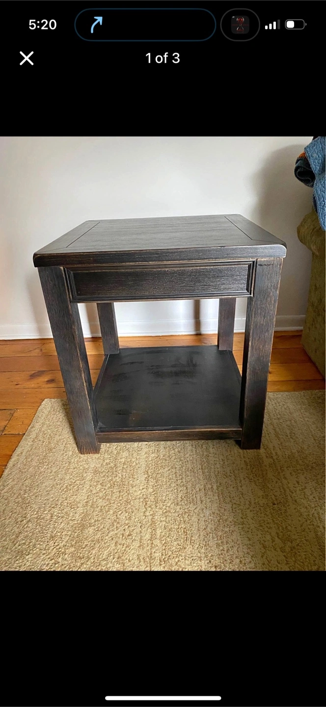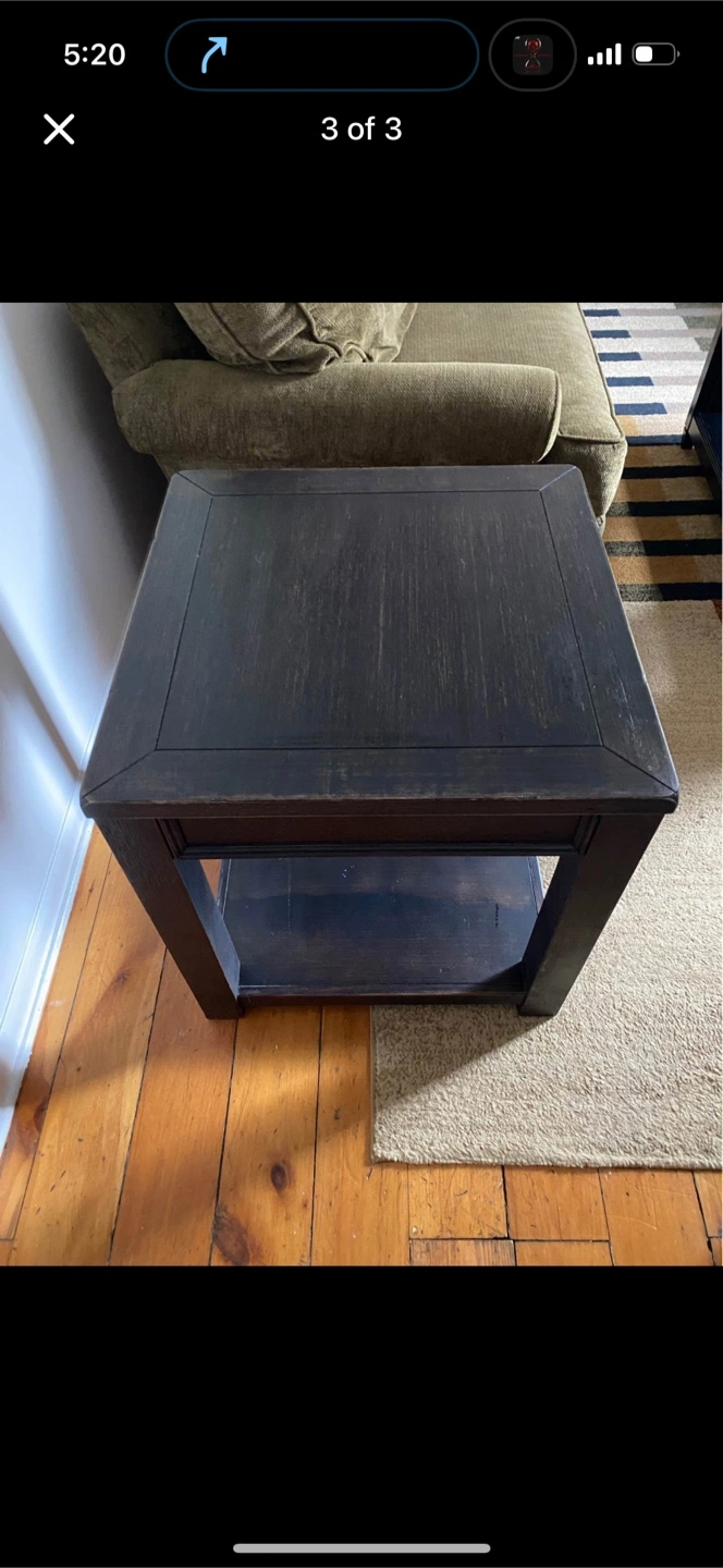 427I'm selling a dark brown wood end table. It has a nice, simple design with a shelf at the bottom for extra storage or display. It's in good condition and would look great in any living room or bedroom!