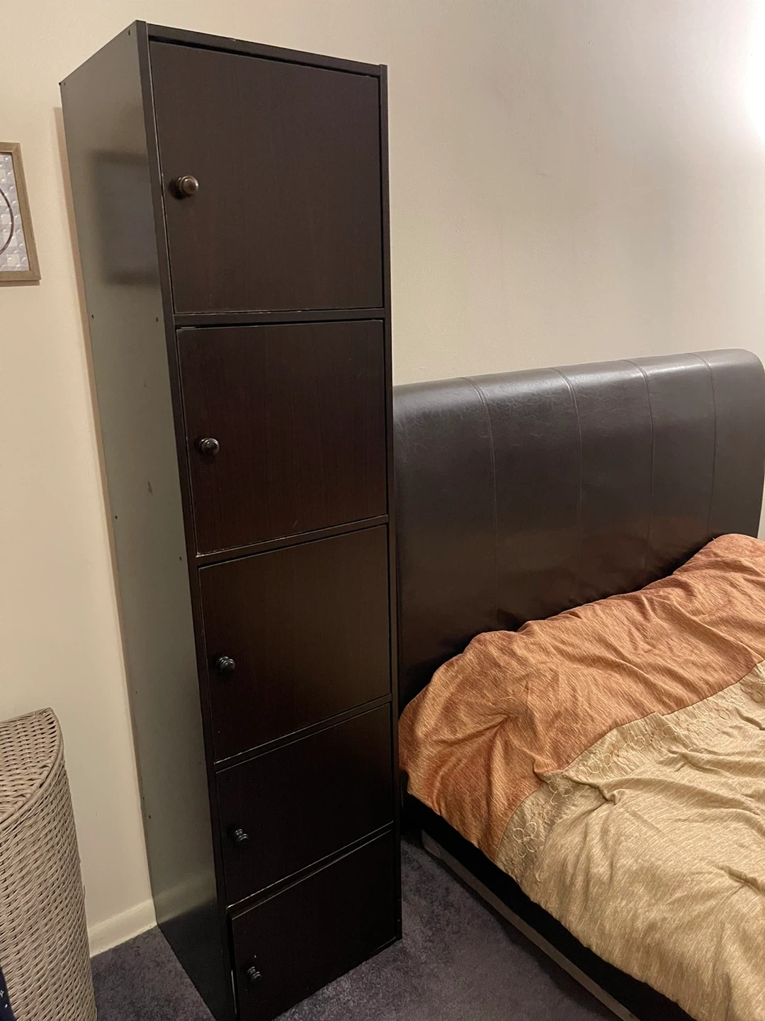 10Selling a dark brown wooden cabinet. It features multiple compartments with doors and knobs, offering plenty of storage space. Perfect for organizing items in any room! Had to go before Saturday.