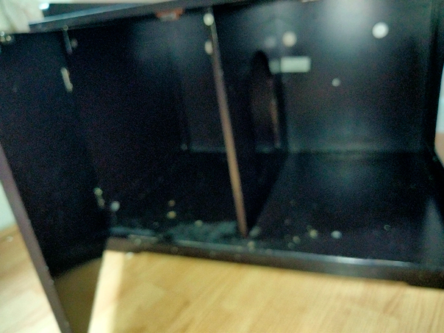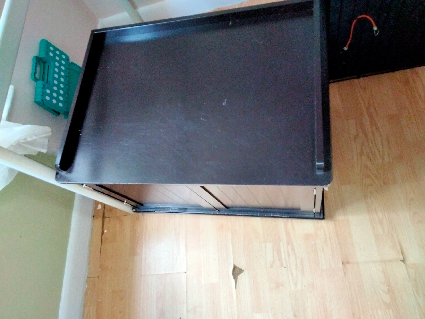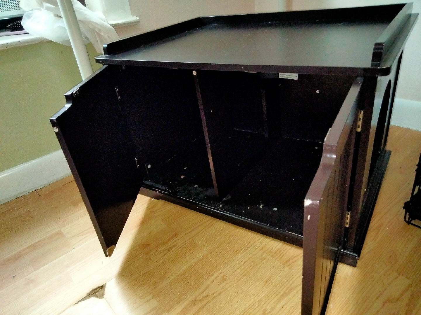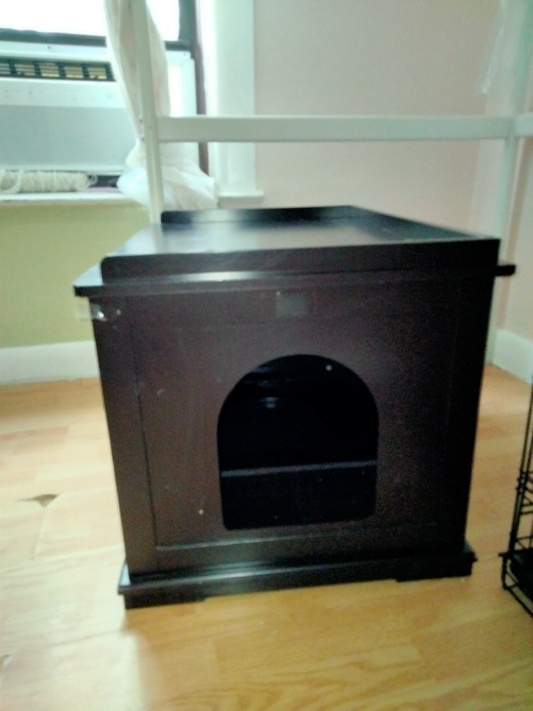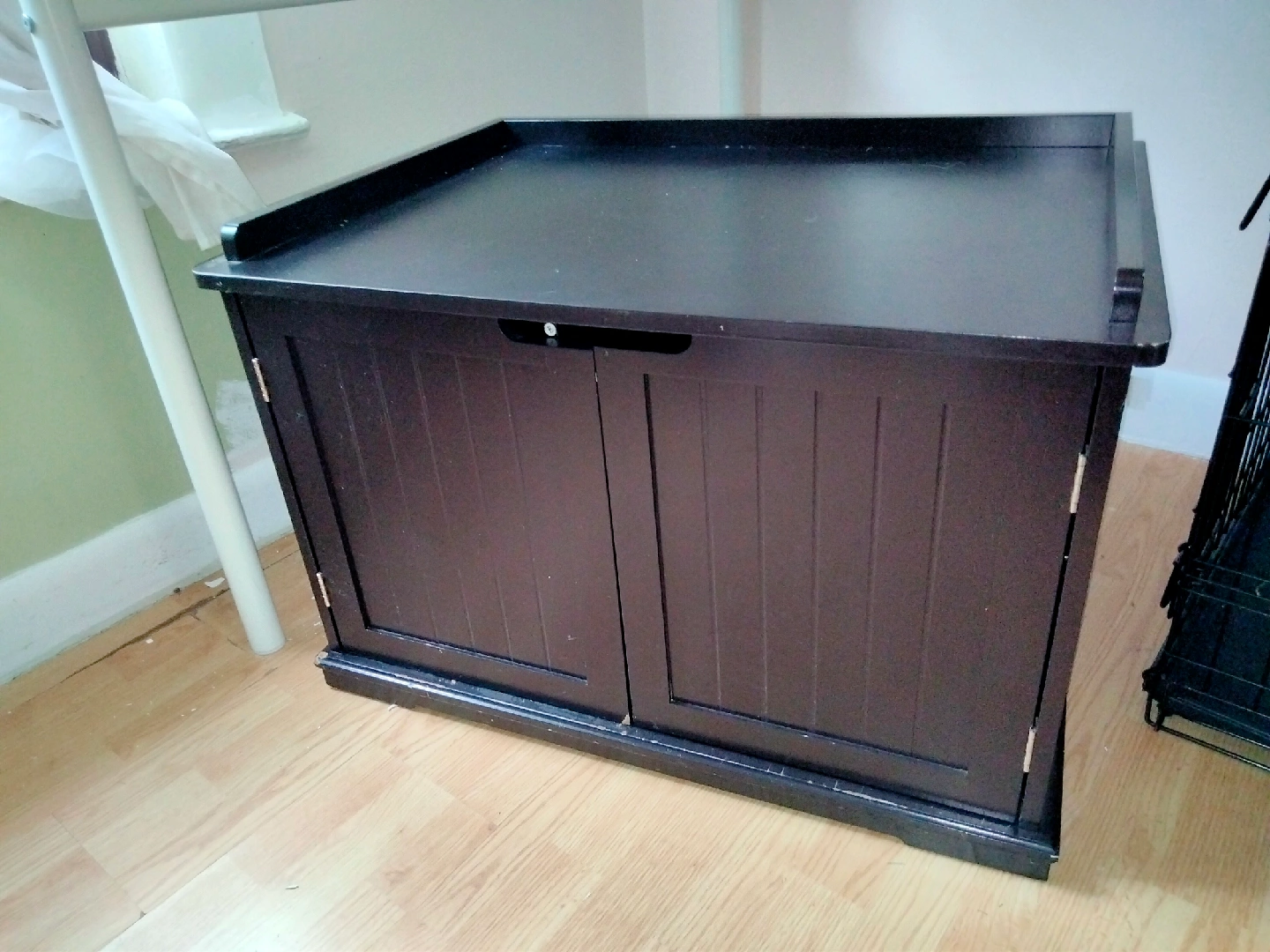 I'm selling a dark brown wooden pet house. It has a top that can be used as a surface and two doors in the front. There is also a hole on the side. good for Cats, rabbits, mauser, etc. 30Lx19Hx22w.