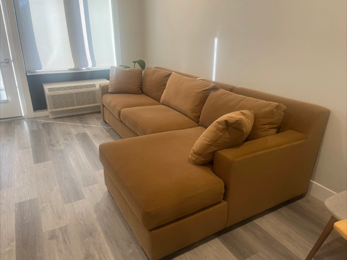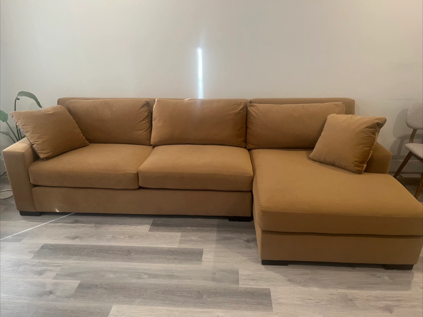 Selling a comfortable dark caramel sectional sofa. Less than two years old. It's in great condition and ready for a new home! No smoking, no pets, like new. The cushions are soft and supportive, perfect for lounging. It's a great piece to add to your living room. 5 year warranty included