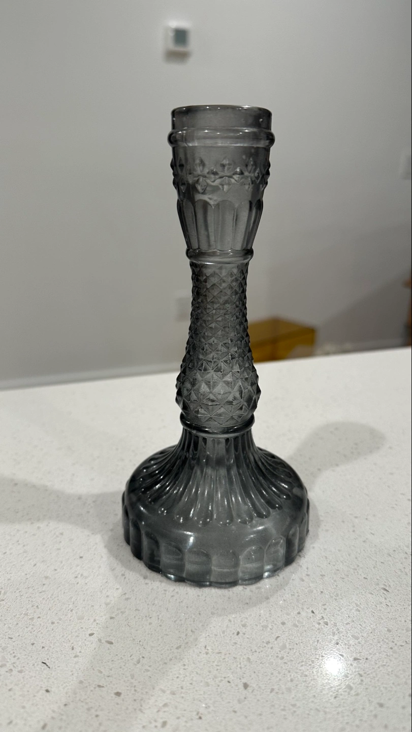 119Elegant dark gray glass candle holder. Features a textured design. Perfect for home decor.