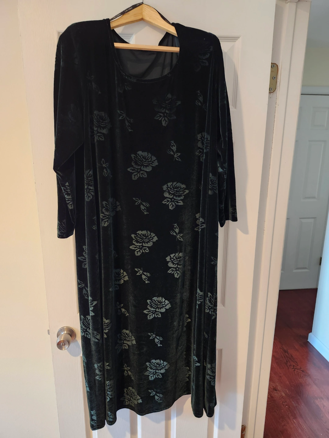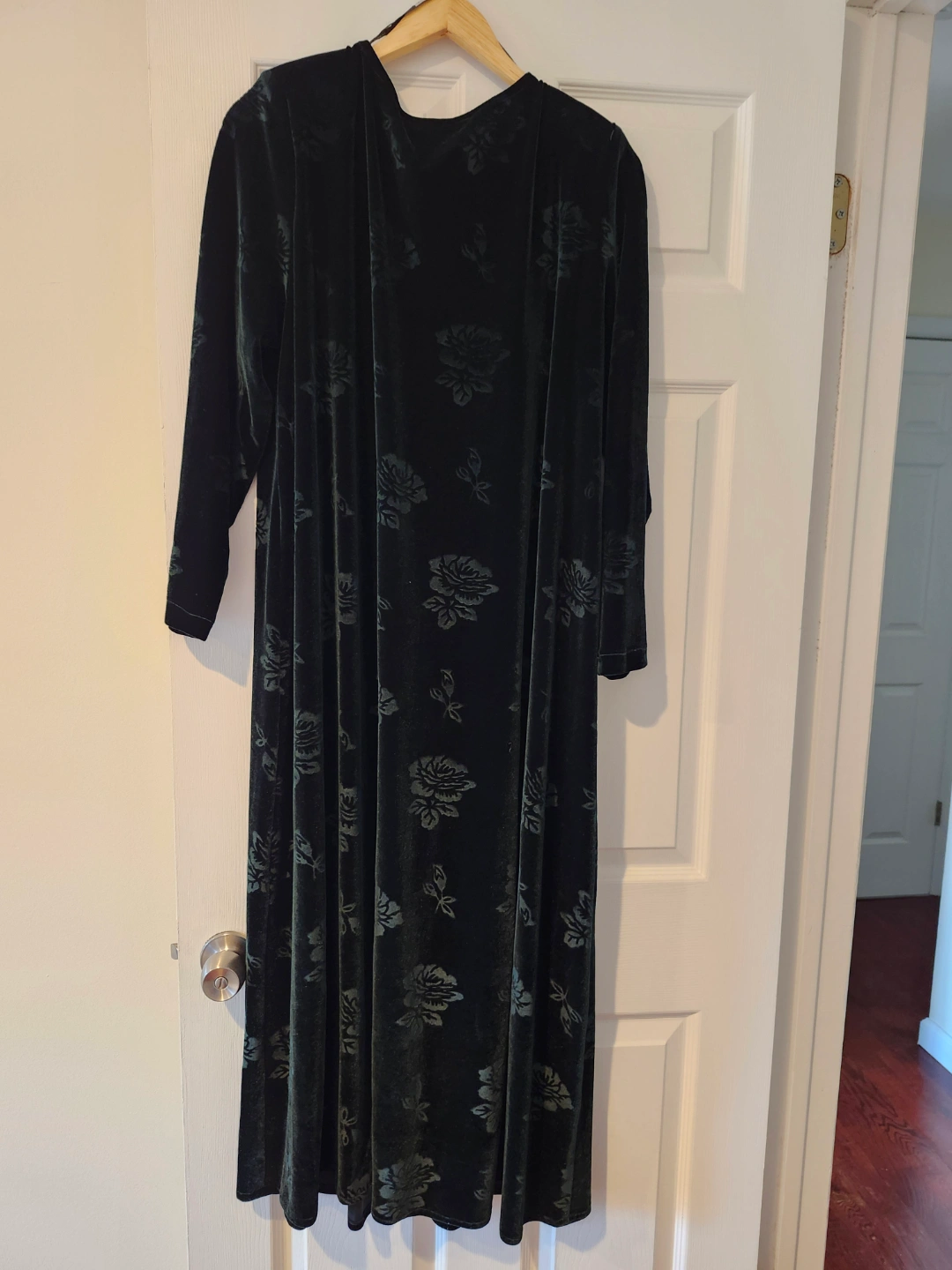 5Women's dark green velvet dress. Features a floral pattern and 3/4 sleeves. Relaxed fit. A-line silhouette. costume mate
