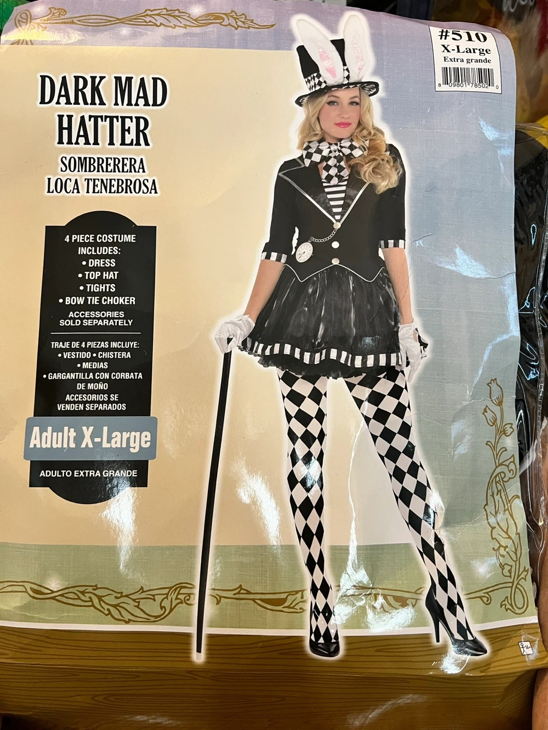 10Selling a Dark Mad Hatter costume in adult X-Large size! This 4-piece costume includes the dress, top hat, tights, and bow tie choker. Get ready for your next costume party!