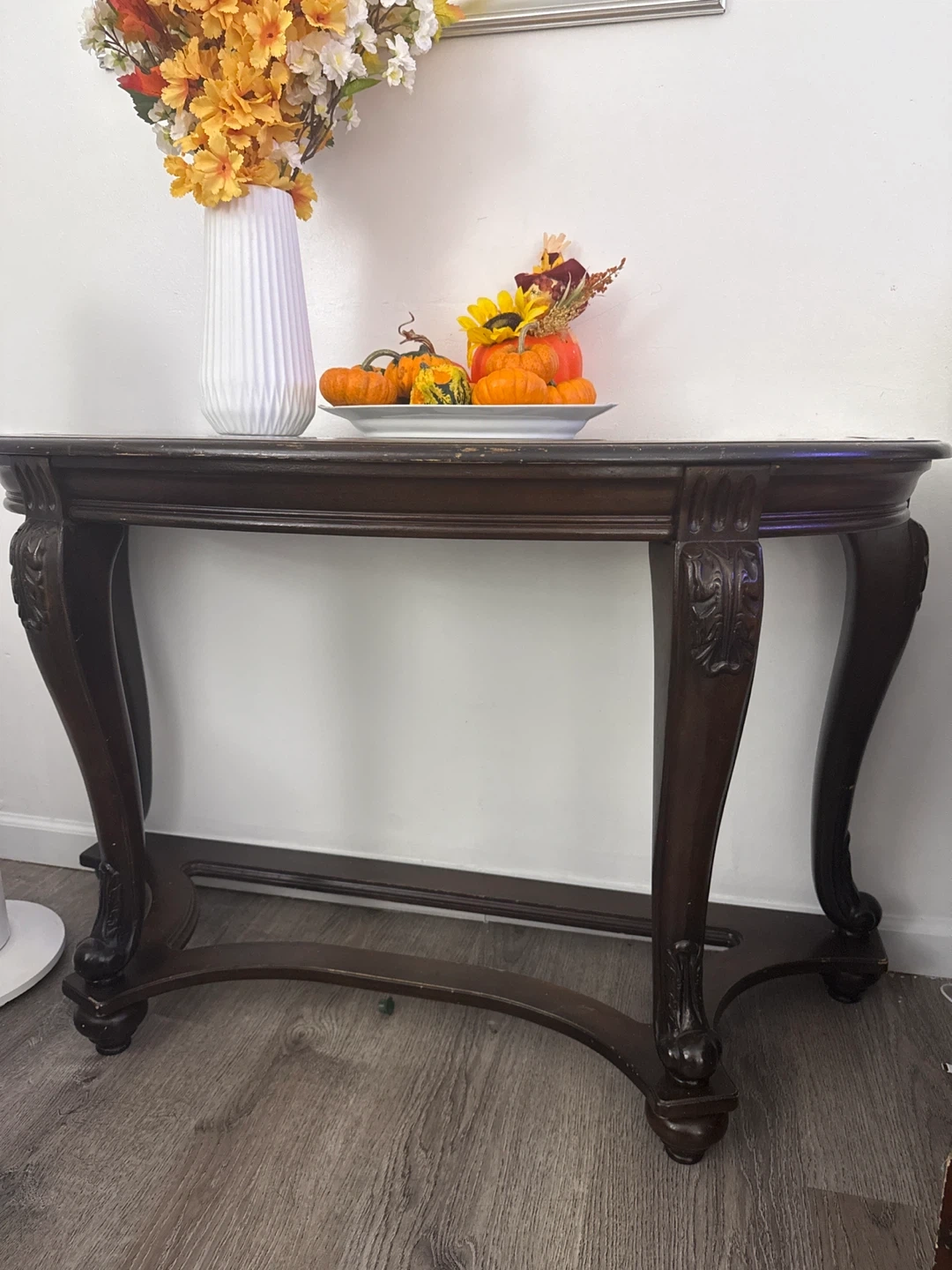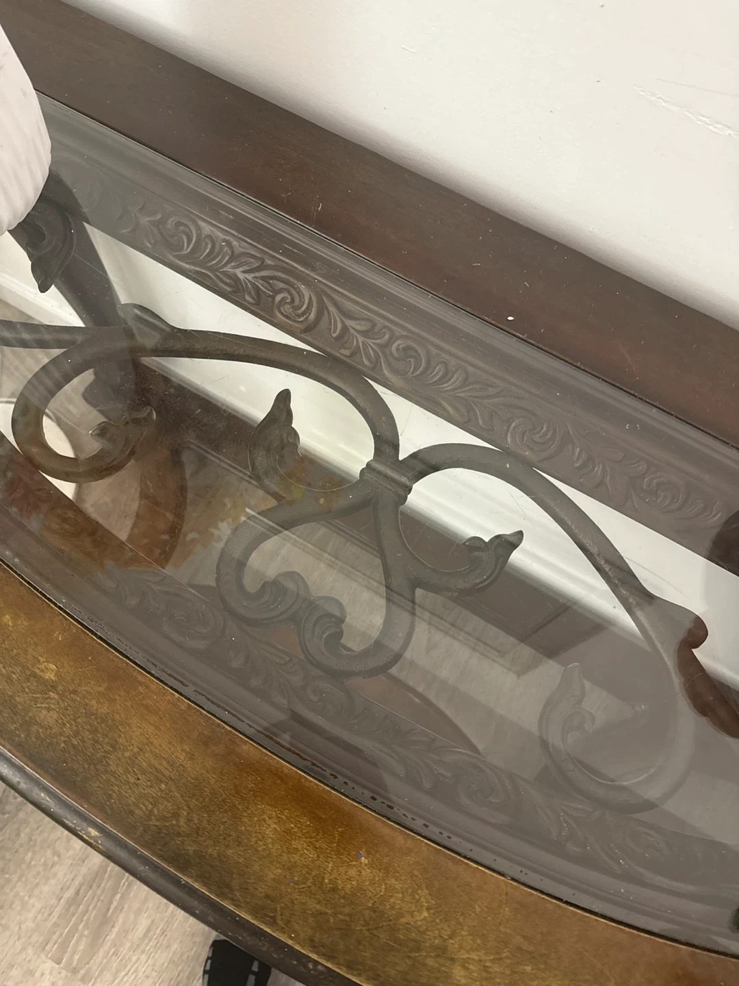 Selling a 100% dark wood console table. It features a glass top and ornate detailing on the legs. It is in good condition and would look great in an entryway or living room. Just needs a bit of paint.