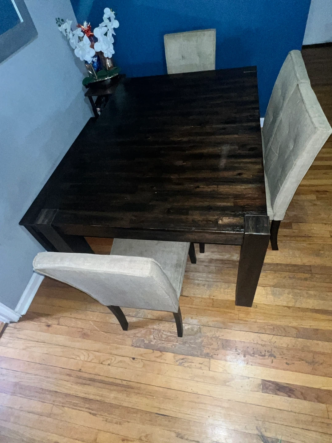 73Selling a dark wood dining table set! It comes with three upholstered chairs and a matching bench. The table has a dark finish and a sturdy construction. Perfect for a dining room or kitchen space! It includes a table extender.