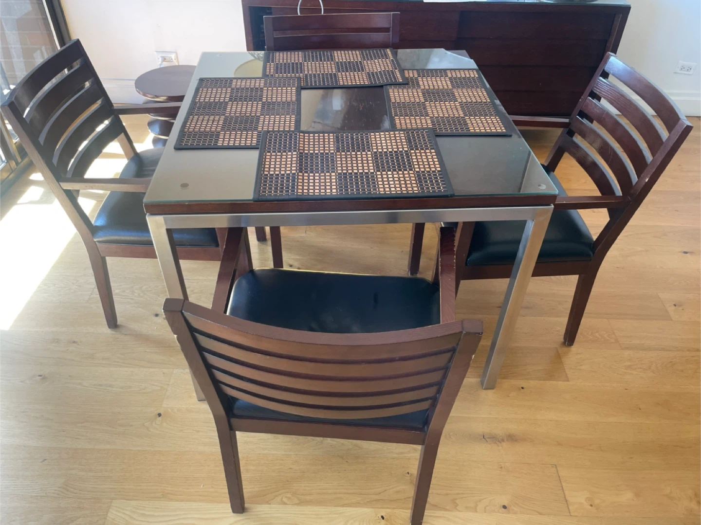 I'm selling a dining table with four chairs with a metal frame. The chairs with black leather seats. It's in good condition and would be a great addition to any dining room Almost new from Ethan Allen