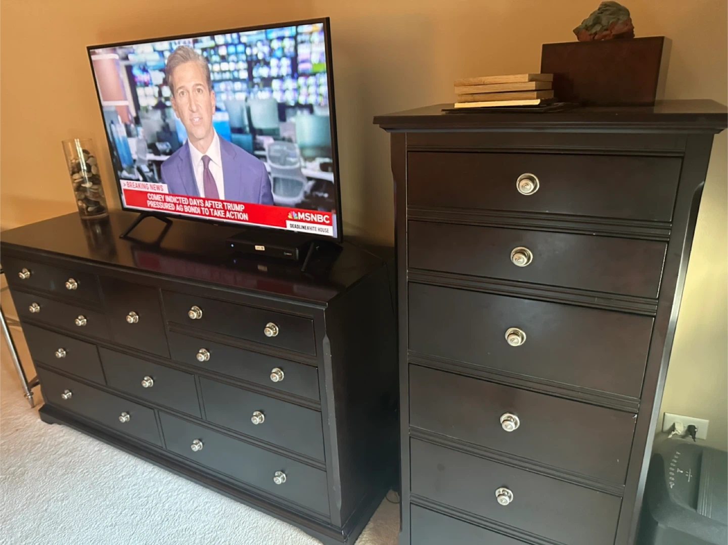 Selling a dark wood dresser and chest set. They're in great condition and would look great in any bedroom!